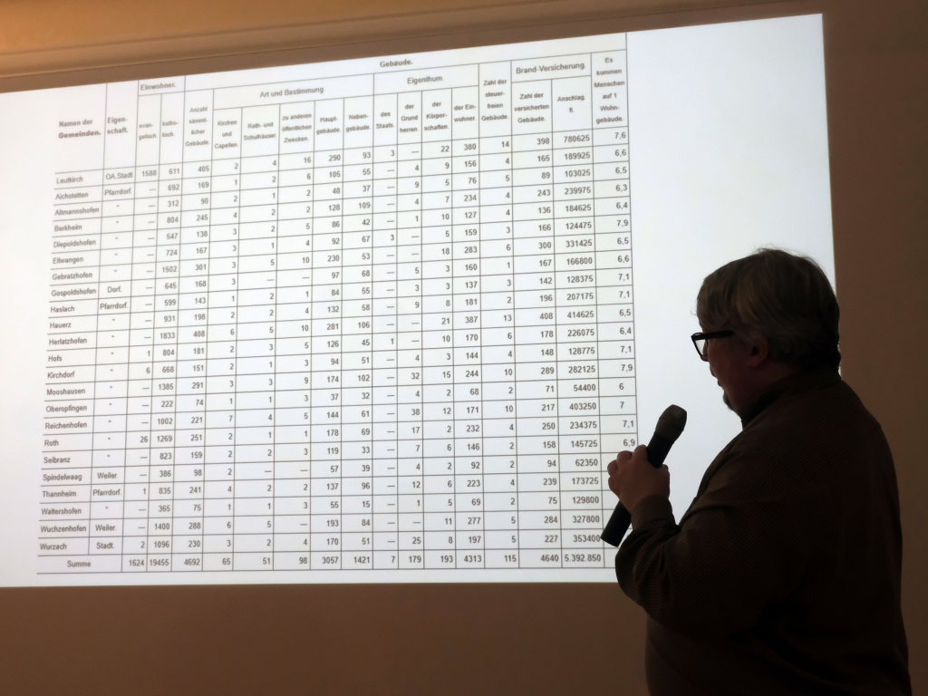Wild erläuterte zu Beginn, dass die Quellenlage – wie meist vor 1945 – schwierig gewesen sei. Aufgrund der großen Zahl von Teilorten habe er diese ausgespart. Er verwies darauf, dass die dortigen Archive zum großen Teil sogar weiter zurückreichen würden.