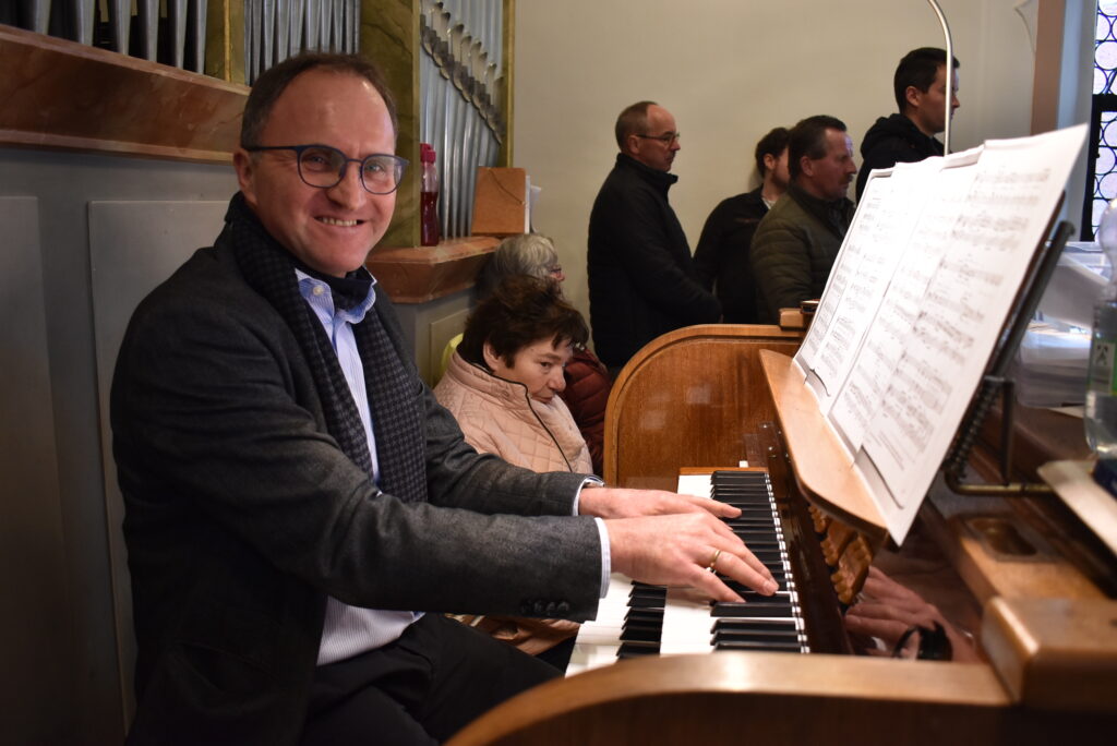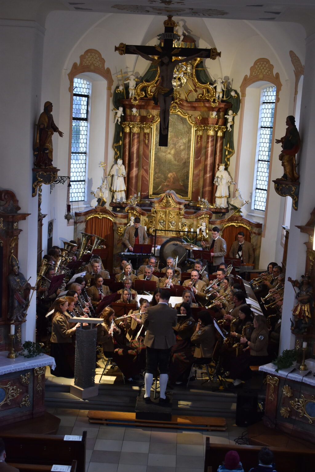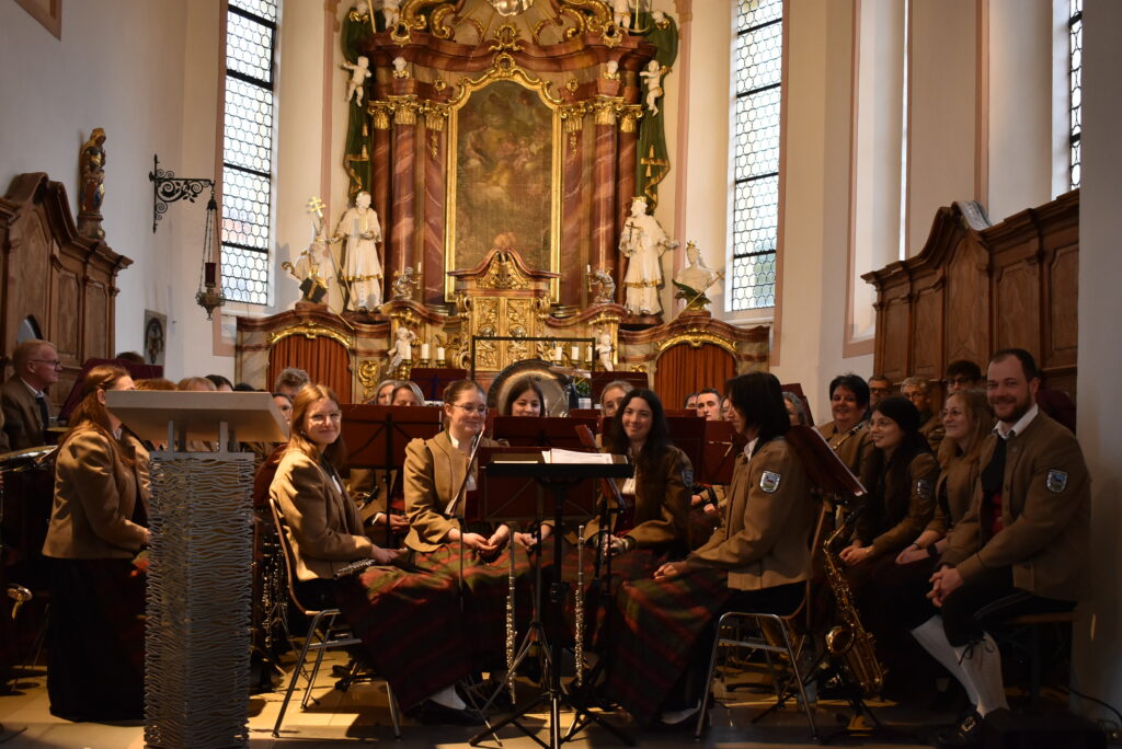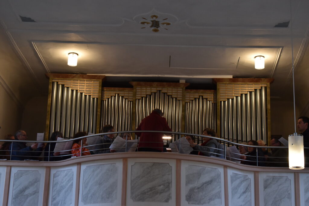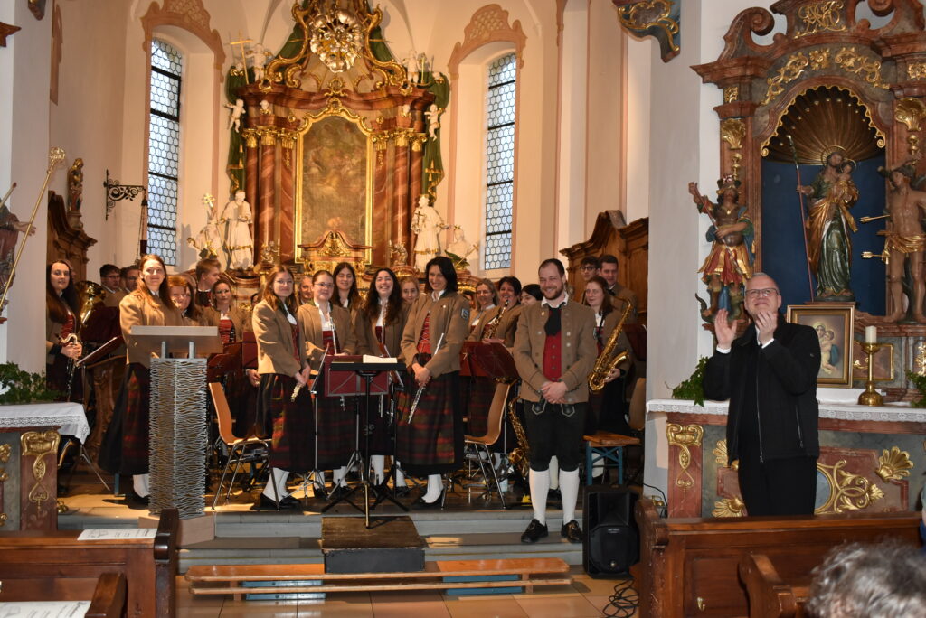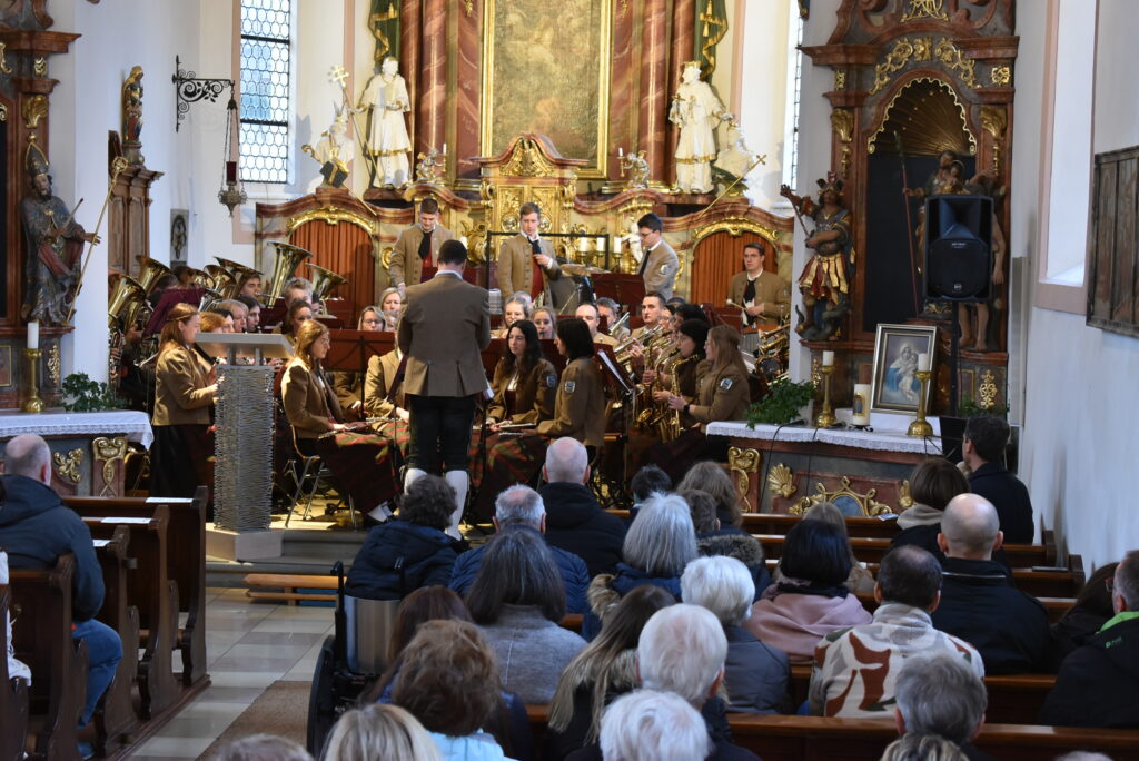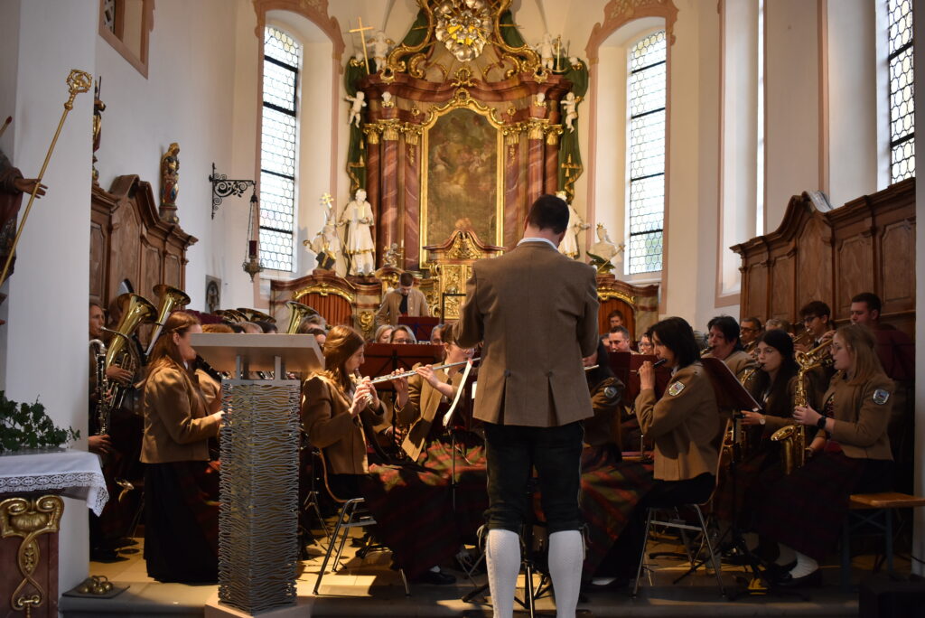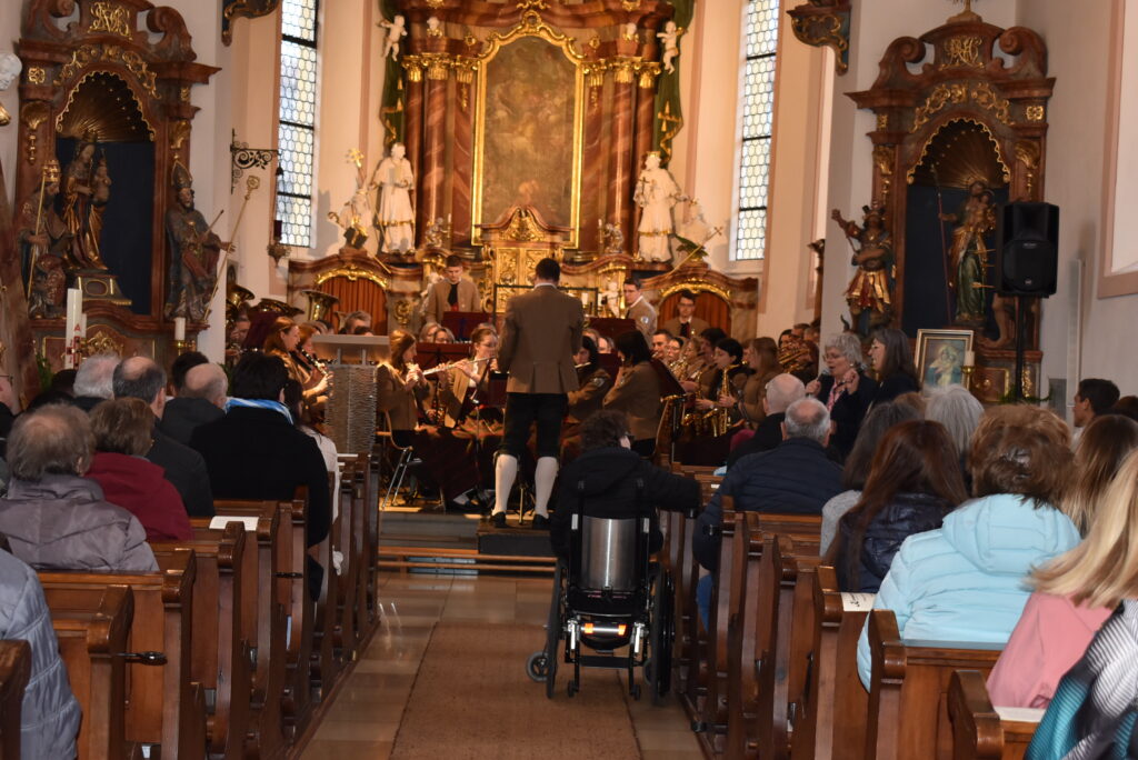 Die Musikkapelle eröffnete im Chorraum mit dem fulminanten und rhythmisch-flotten „Chicago Festival“ und jeder konnte die wunderbare Akustik im Barockjuwel dieser Dorfkirche erleben. Festlicher und etwas ruhiger zeigte sich das Stück „All glory told“ in sehr harmonischen Klangfarben. Der Kirchenchor hatte sich auf der Empore platziert und ließ seine schönen Lieder über die Besucher „herunterfließen“. Organist Markus Heinrich begleitet die Stücke gefühlvoll, die alle zur Ehre Gottes erklangen.