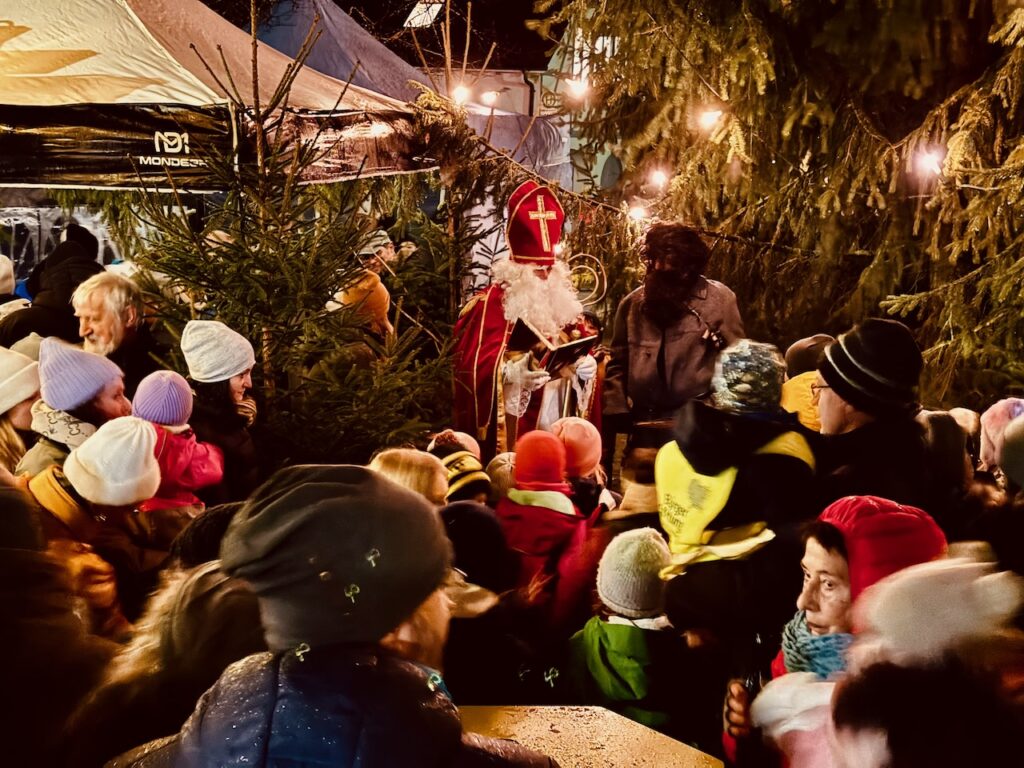 Um 18.00 Uhr war es dann so weit. Der Nikolaus und sein Knecht Ruprecht statteten dem Weihnachtsmärktle einen Besuch ab. Nach der Ansprache durch den Nikolaus wurde noch gemeinsam mit den Kindern gesungen. Spätestens als der Ruprecht jedem Kind ein kleines Nikolaussäckchen überreichte, brachte er damit die Kinderaugen zum Leuchten.