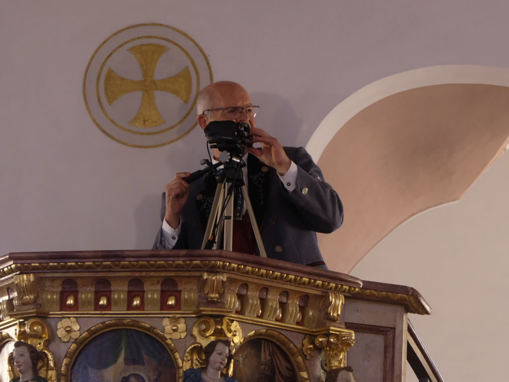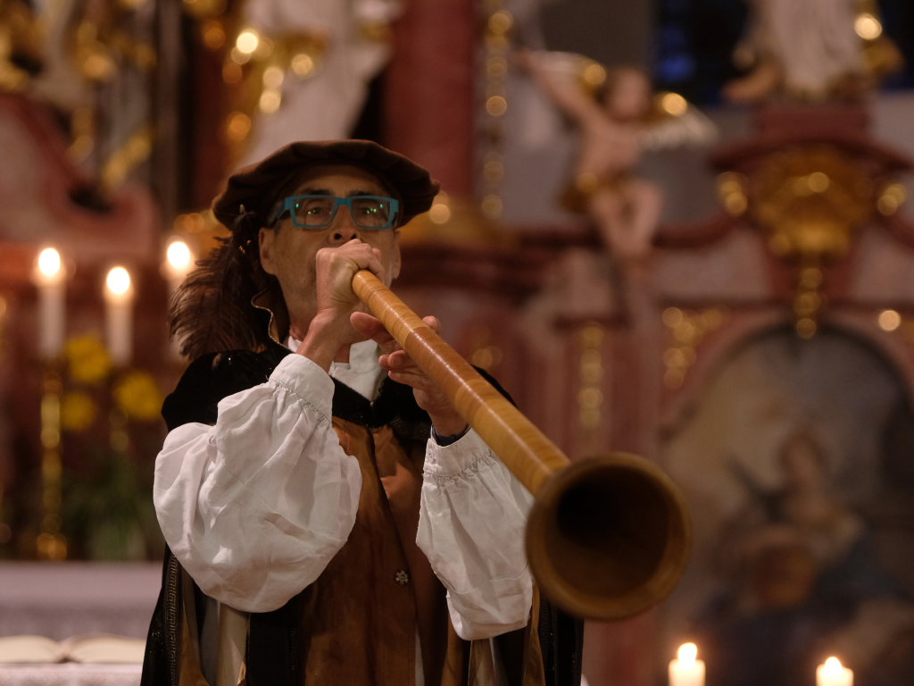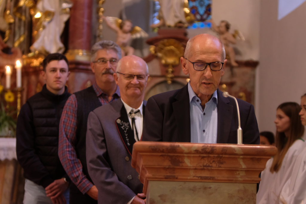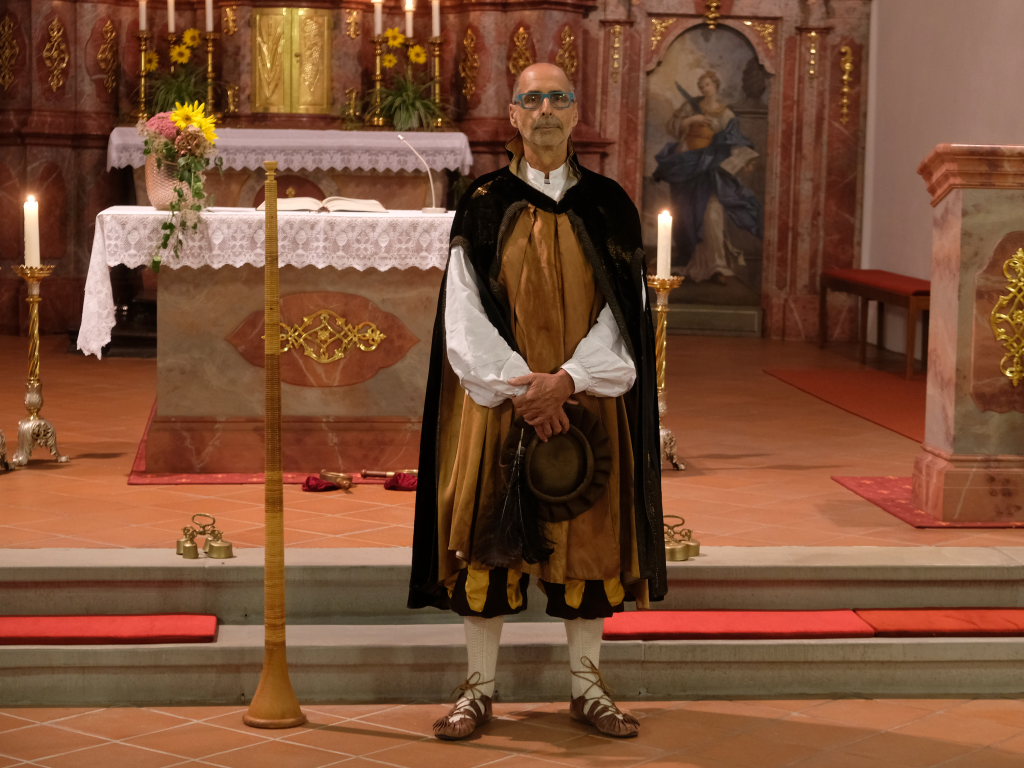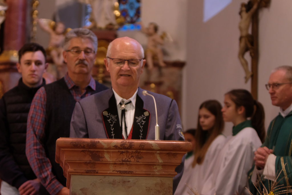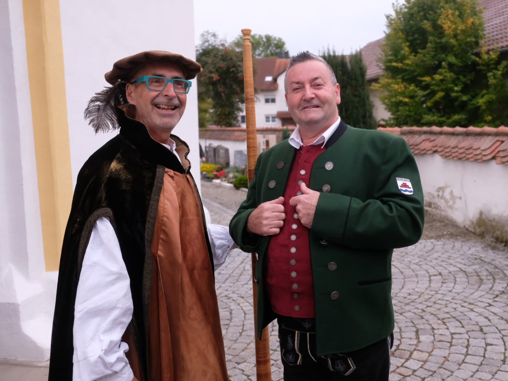 Nachdem der Kirchenchor die deutsche Version von Amazing grace – Ein schöner Tag – zur Kommunion intoniert hatte und nachdem Pfarrer Meschenmoser den Schlusssegen gespendet hatte, leitete Bernhard Bitterwolf mit einem kleinen Musikstück, gespielt auf dem in dieser Gegend weit verbreiteten Hirteninstrument, dem Piffel, der auf dem Deckengemälde von St. Verena verewigt ist, zum zweiten Teil des Festaktes in der Kirche über. Während heute gerade einmal zwei Prozent der Bevölkerung in der Landwirtschaft tätig sind, waren es damals 90%. Für diese gab der Hirte mit dem Piffel das Zeichen, dass die Nacht vorbei ist und die Kühe aus den Ställen auf die Weide gehören.