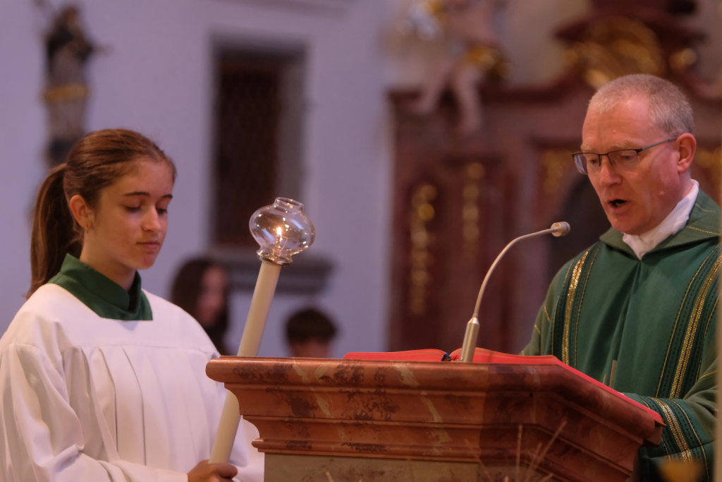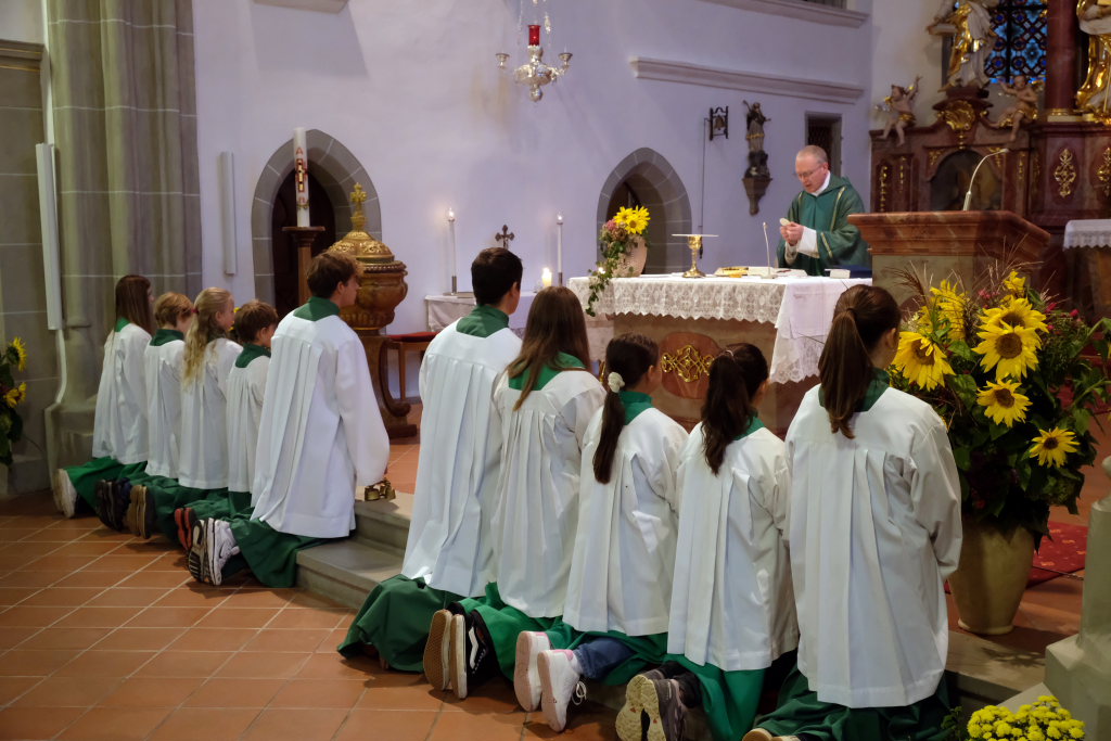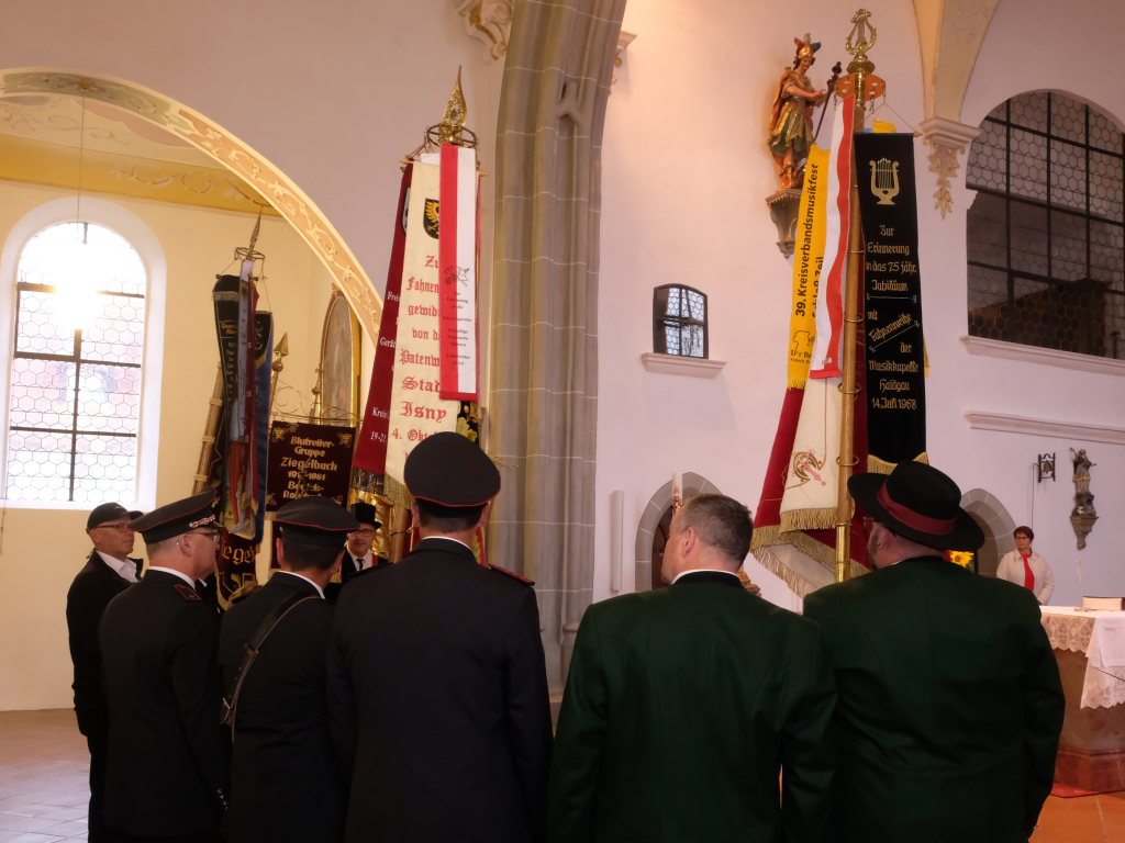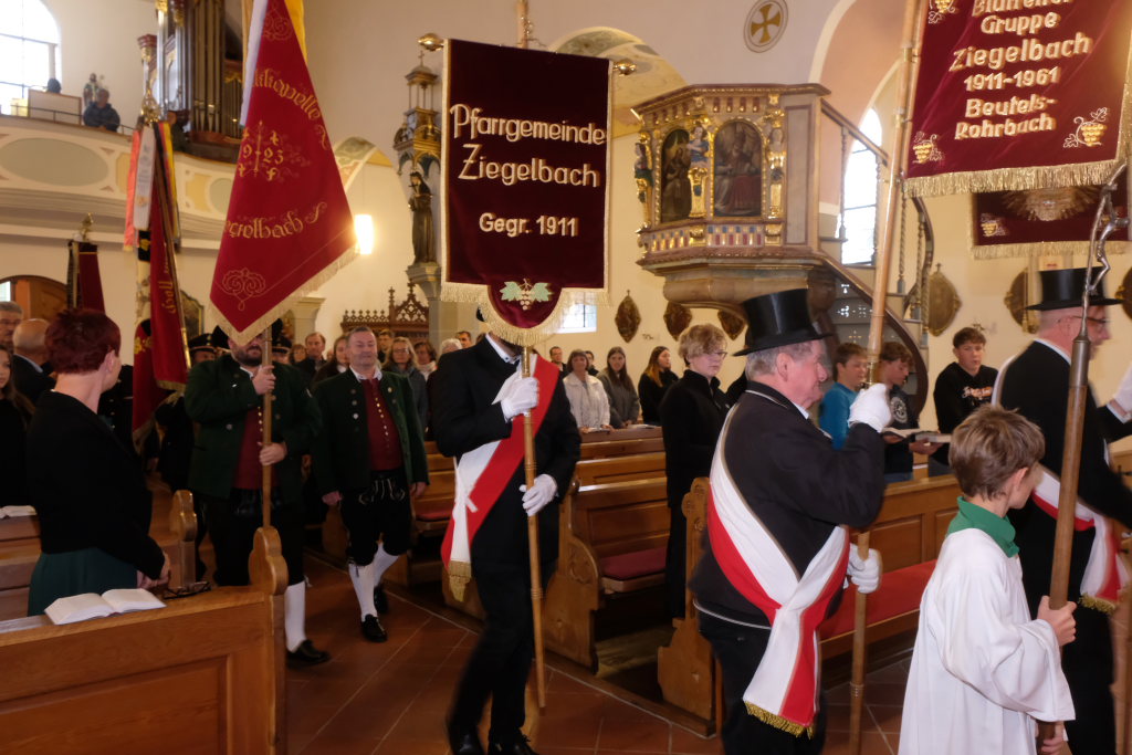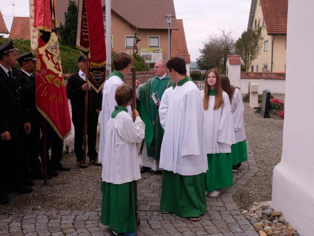Mit zehn Ministranten, den Fahnenabordnungen von Feuerwehr, Blutreitern, Musik und Kriegerverein zog die Festgemeinde unter den Klängen des Kirchenchores mit Pfarrer Patrick Meschenmoser zum Festgottesdienst in die Kirche ein.