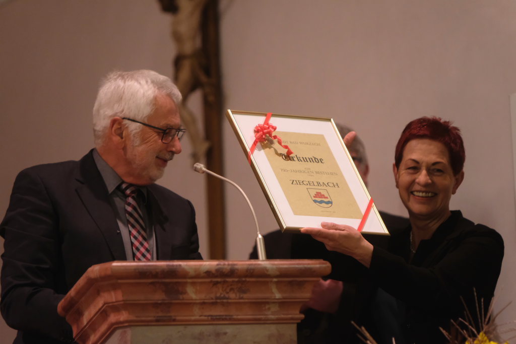 „Wir feiern in zwei Wochen 50 Jahre Eingemeindung. Diese war den damaligen kommunalen Herausforderungen geschuldet und notwendig, “ ging er auf die jüngste Vergangenheit der Ortschaft ein. Es sei eine Herausforderung für Ziegelbach, die anderen acht selbstständigen Ortschaften, aber auch für die Kernstadt gewesen. Die Ziegelbacher haben in ihrer Weitsicht erkannt, dass diese Gemeindereform für die kommunale Weiterentwicklung ihrer Gemeinde unabdingbar war. In diesen 50 Jahren habe man gemeinsam in Ziegelbach viel geschaffen und erreicht. Der Ort sei mit seiner Infrastruktur wie Schule, Kindergarten, Wasser- und Abwasserversorgung, einem großen Neubaugebiet und seinen zahlreichen Vereinen sowie natürlich dem Dorfstadel gut für die Zukunft gerüstet. Heute feiere man die Menschen, die Ziegelbach zu dem gemacht hatten, was es heute sei. Er freue sich auf die anschließende Feier und den Übergang von den alten Zeiten in das jetzt. Er war nicht mit leeren Händen gekommen: Neben der finanziellen Zuwendung zum Fest, die die Stadt gewährte, überreicht er Ortsvorsteherin Sybille Schleweck eine Urkunde „750 Jahre Ziegelbach“.