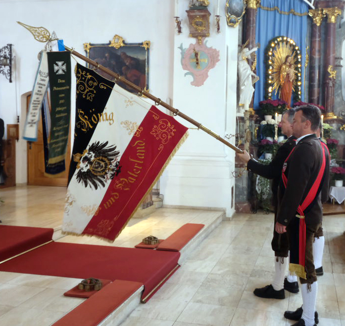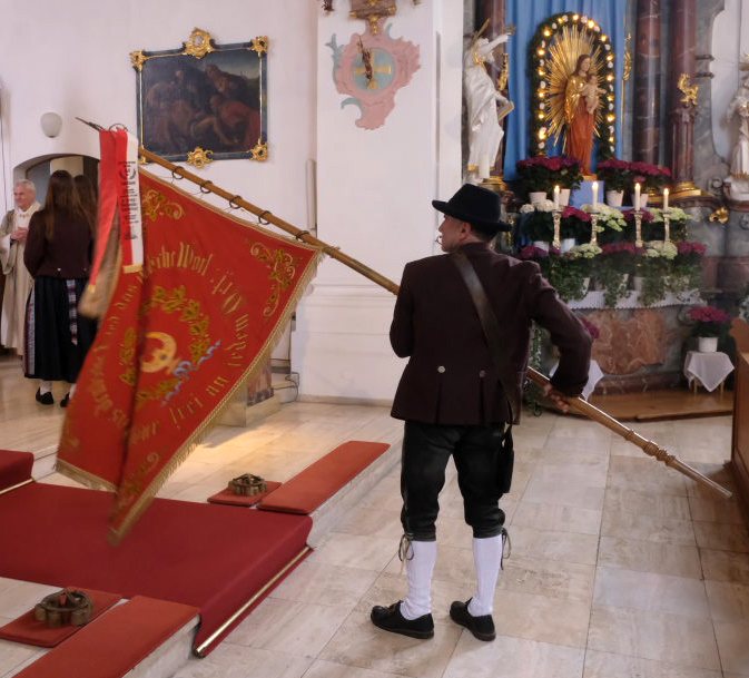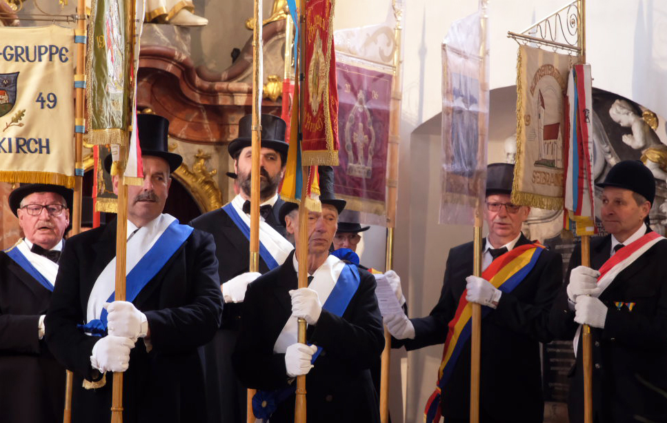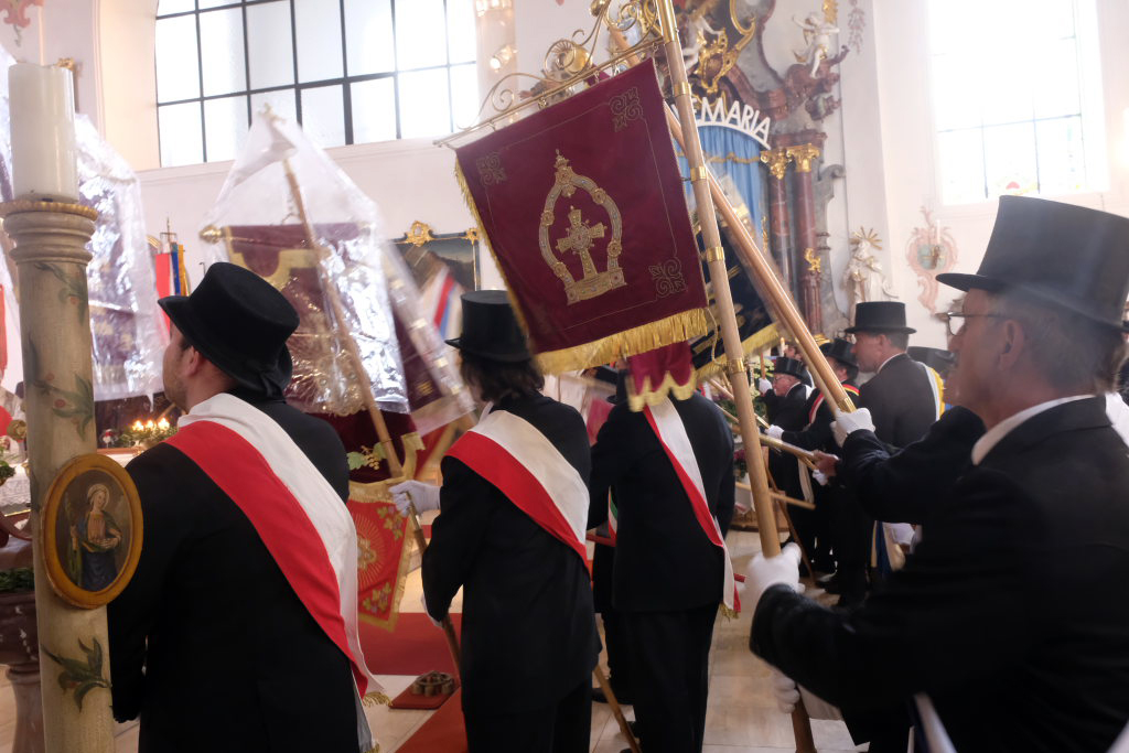 Neun Blutreiter-Gruppen waren mit ihren Standarten im Chor der Arnacher Kirche vertreten. Unser Bild zeigt einen Teil der Blutreiter, darunter die beiden Arnacher Standartenträger Bruno Natterer und Klaus Schneider.