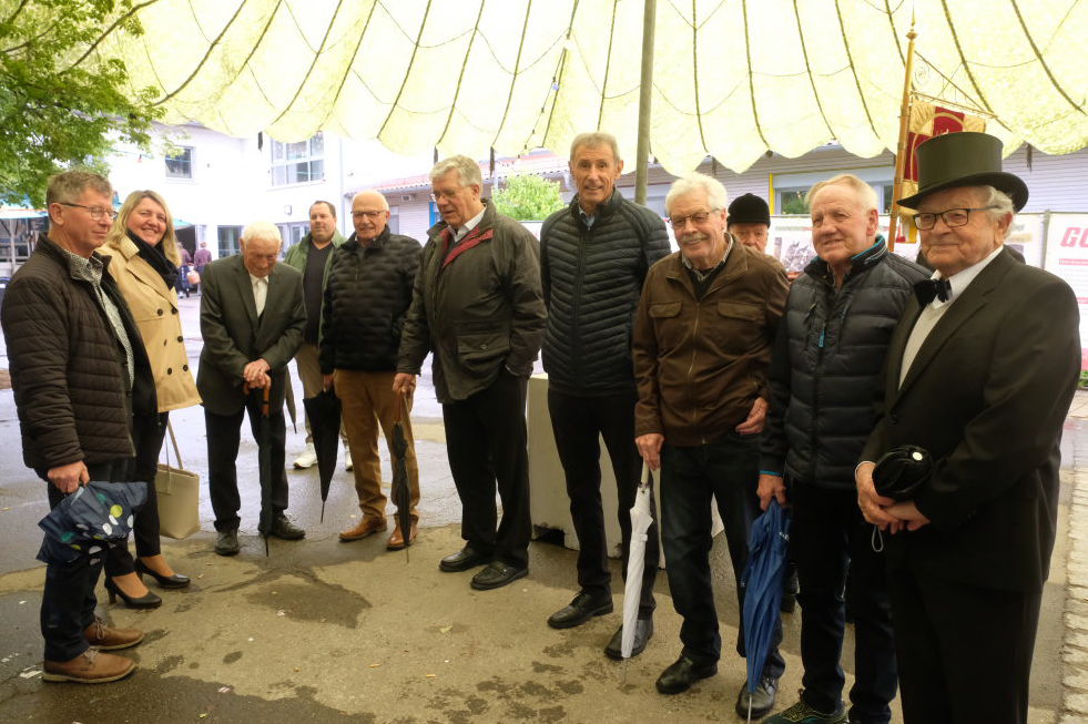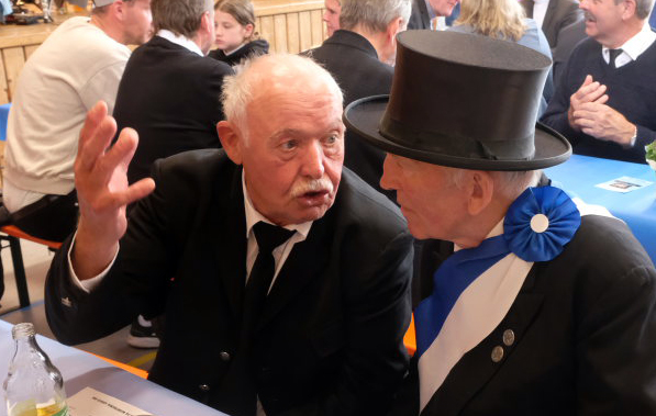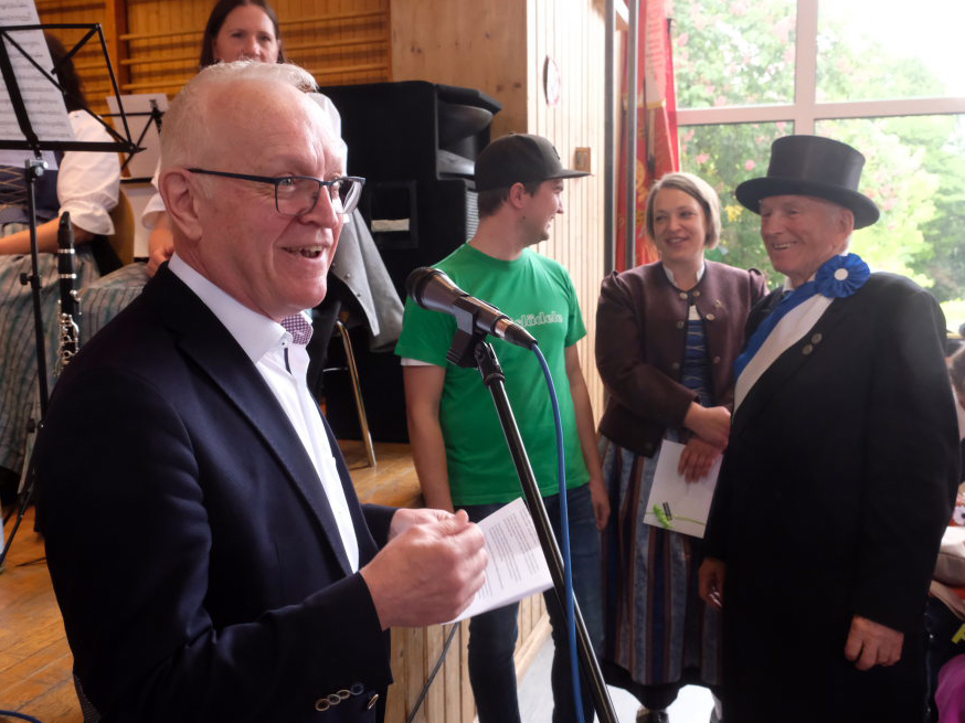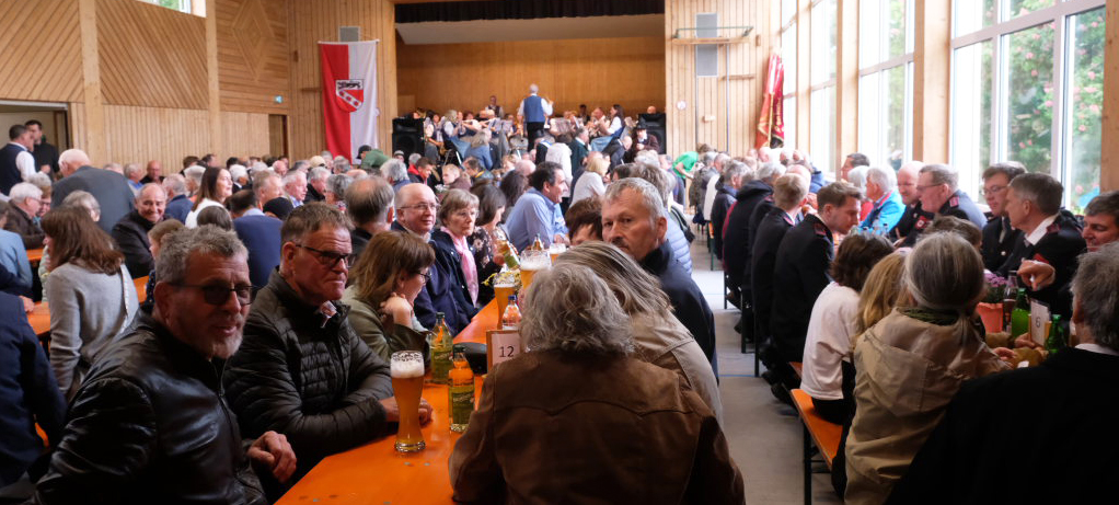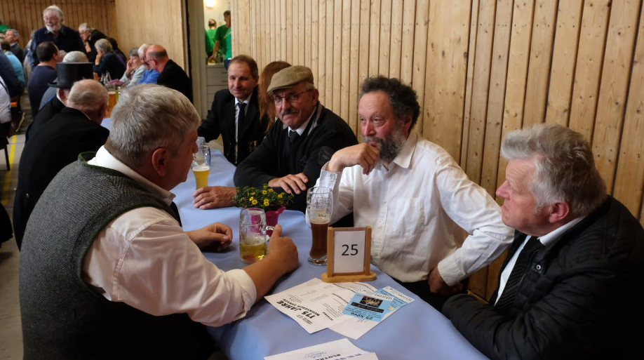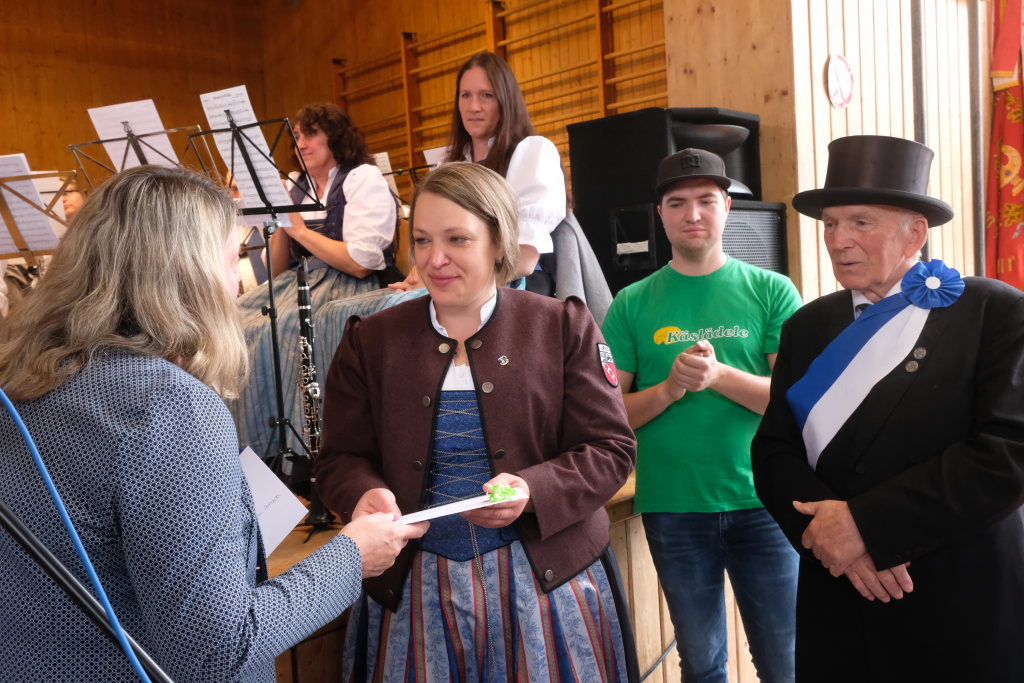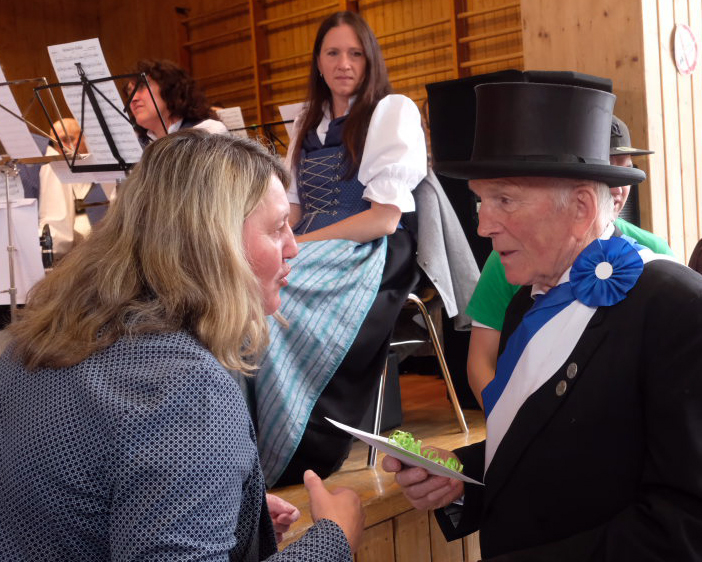 Mit dem Marsch „Heimatland“ geleitete die Musikkapelle den Festzug zurück zum Festgelände, wo der Musikverein Seibranz (Leitung: Erich Minsch) – witterungsbedingt in der Festhalle, nicht im Freien – die musikalische Begleitung des Frühschoppens übernahm, bei dem kurze Grußworte gesprochen und die Jubliäumsgaben überreicht wurden. Gekommen war auch der Landtagsabgeordnete Raimund Haser, um den beiden Arnacher Jubiläumsvereinen seine Aufwartung zu machen.