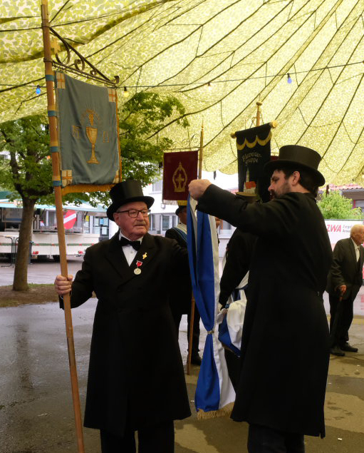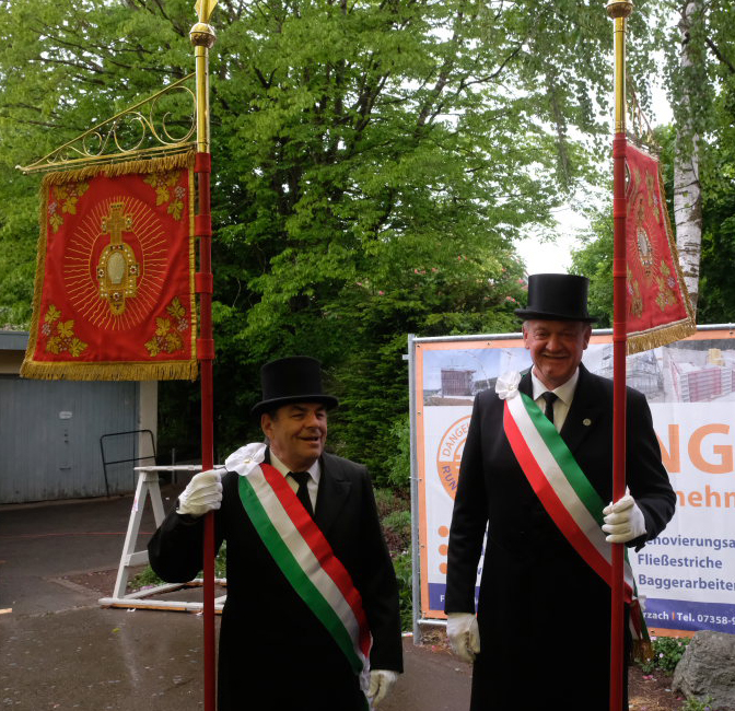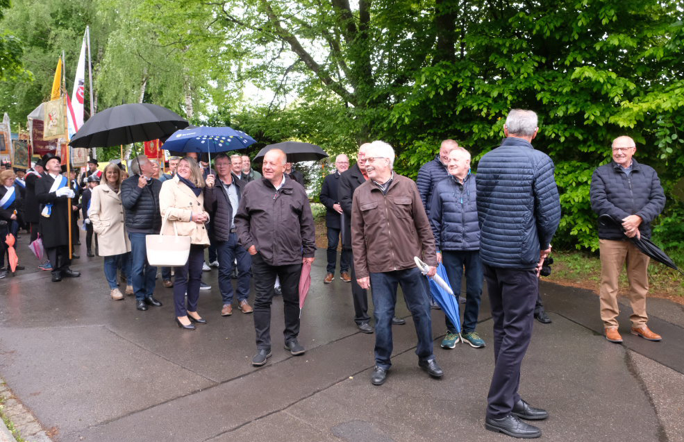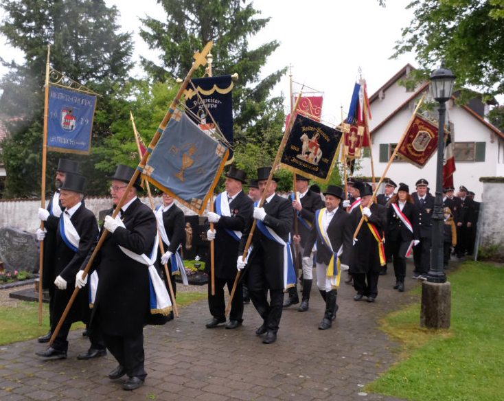 Arnach – Auch der Sonntag des Jubiläumswochenendes begann mit einem Festzug. An diesem regnerischen Sonntagmorgen (25.5.) standen beim Kirchgang neben der 175-jährigen Jubel-Kapelle die Blutreiter mit  ihrem 100-jährigen Jubiläum im Mittelpunkt. Im Anschluss an den Festgottesdienst ging es wieder zurück zur Festhalle, wo die beiden Jubiläen mit Frühschoppen und Nachmittagskaffee ausklangen.