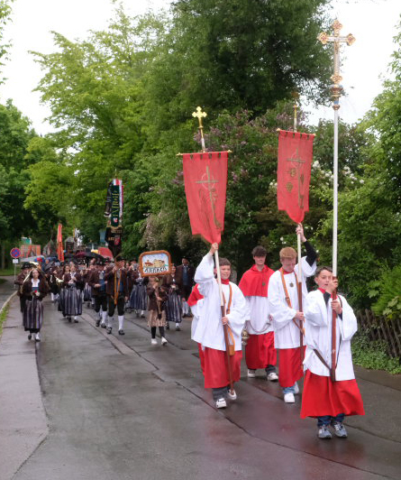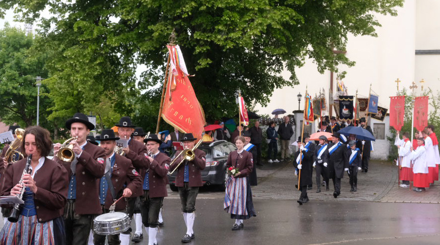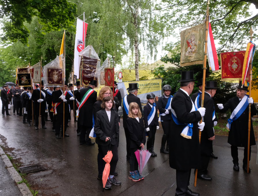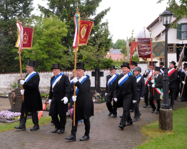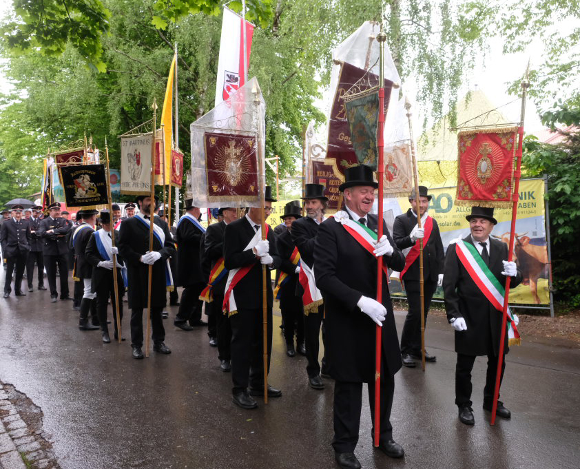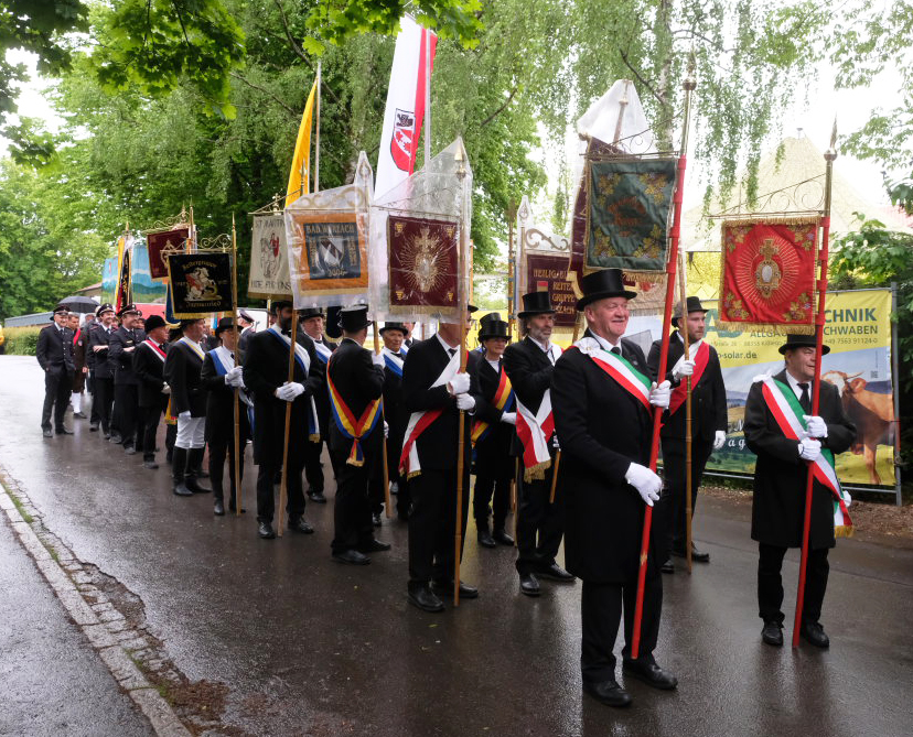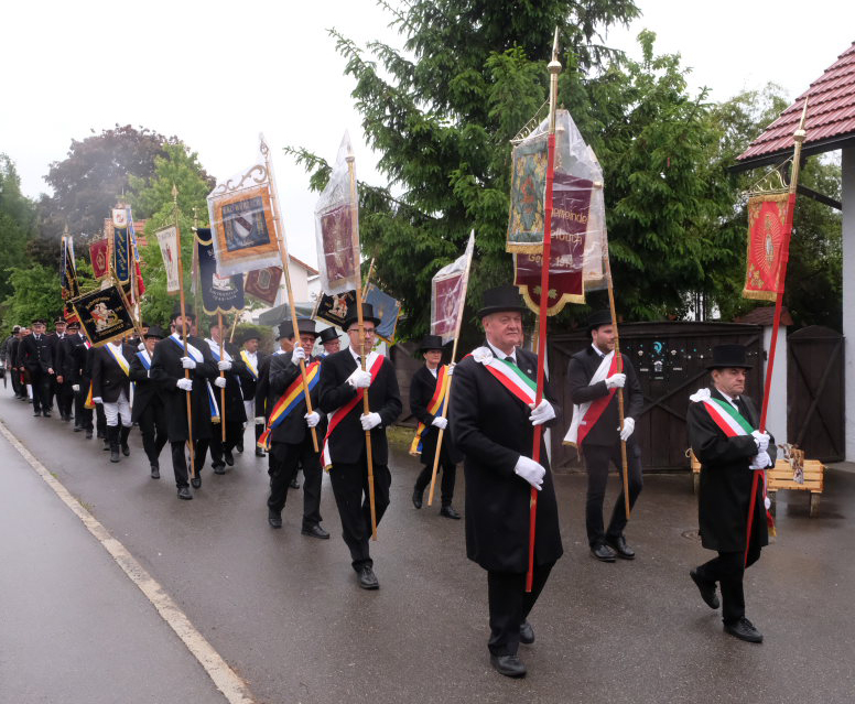 Mit dem „Kleinen Prozessionsmarsch“ geleitete der Musikverein Arnach die Prozession mit Pfarrer Patrick Meschenmoser und Superior Konrad Werder vom Schulhof zur Kirche. Neben den beiden Vereinsfahnen des Musikvereines und den Fahnen von Feuerwehr und Soldaten- und Schützenkameradschaft  (Bild) folgten dem Vortragekreuz insgesamt neun Blutreitergruppen aus der Region mit ihren Standarten.