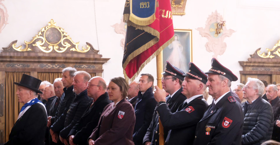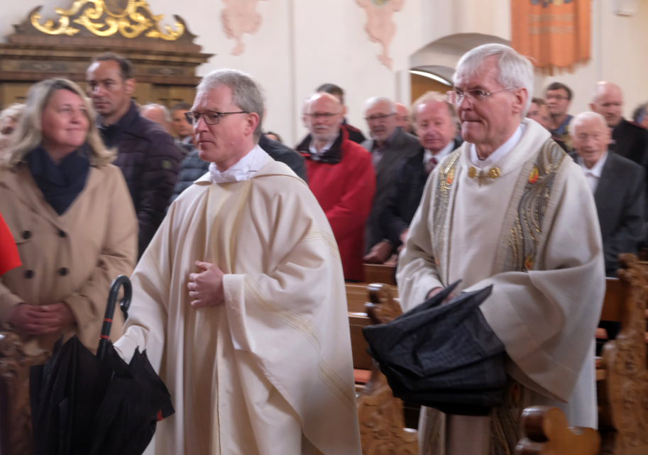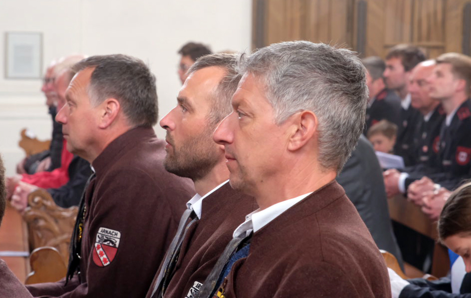 Nach dem Einzug in die Kirche begab sich die kleine Bläsergruppe des Arnacher Musikvereins hinauf auf die Empore, von wo aus sie den Gottesdienst gemeinsam mit der Orgel musikalisch begleitete, während die anderen Musiker sowie die Ehrengäste zu den für sie reservierten Kirchenbänken gingen und die Standarten- und Fahnenträger im Chorraum Platz nahmen.