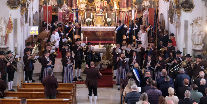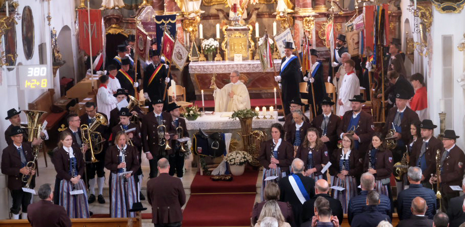 Am Schluss des Festgottesdienstes aus Anlass des 175-jährigen Bestehens des Musikvereins Arnach und des 100-jährigen Bestehens der Blutreitergruppe Arnach spielte der Musikverein „Großer Gott, wir loben Dich“. Unser Bild zeigt einen Teil der Musikantenschar.
