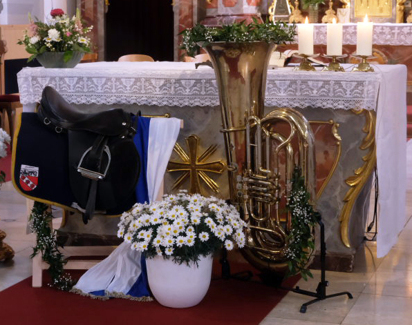 Am Altar waren aus Anlass der beiden Vereinsjubiläen symbolisch ein Sattel mit Arnach-Schabracke und eine Tuba platziert.