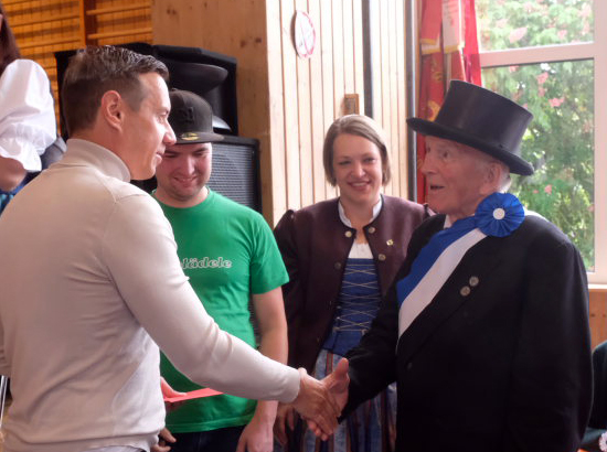 Berthold Schöllhorn vom Sportverein Arnach gratuliert Blutreitergruppenführer Hansjörg Schick zum 100-jährigen Bestehen der Blutreitergruppe.