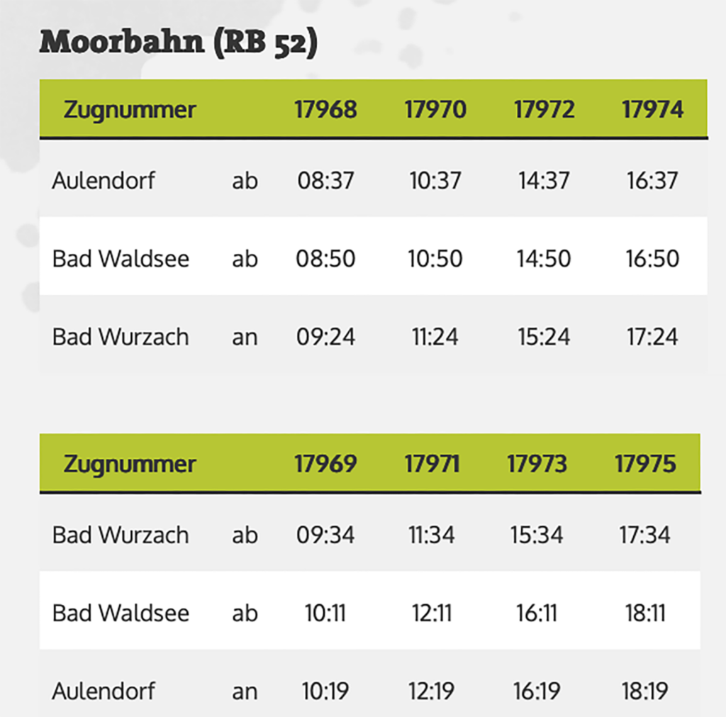 Die Abfahrten ab Aulendorf sind um 8.37, 10.37, 14:37 und 16.37 Uhr. Rückfahrmöglichkeiten ab Bad Wurzach bestehen um 9:34, 11:34, 15:34 und 17:34 Uhr.  Detaillierte Fahrplanauskünfte gibt´s unter bodo.de bzw. per bodo FahrplanApp oder auch unter bahn.de. Die Radmitnahme ist kostenfrei möglich.