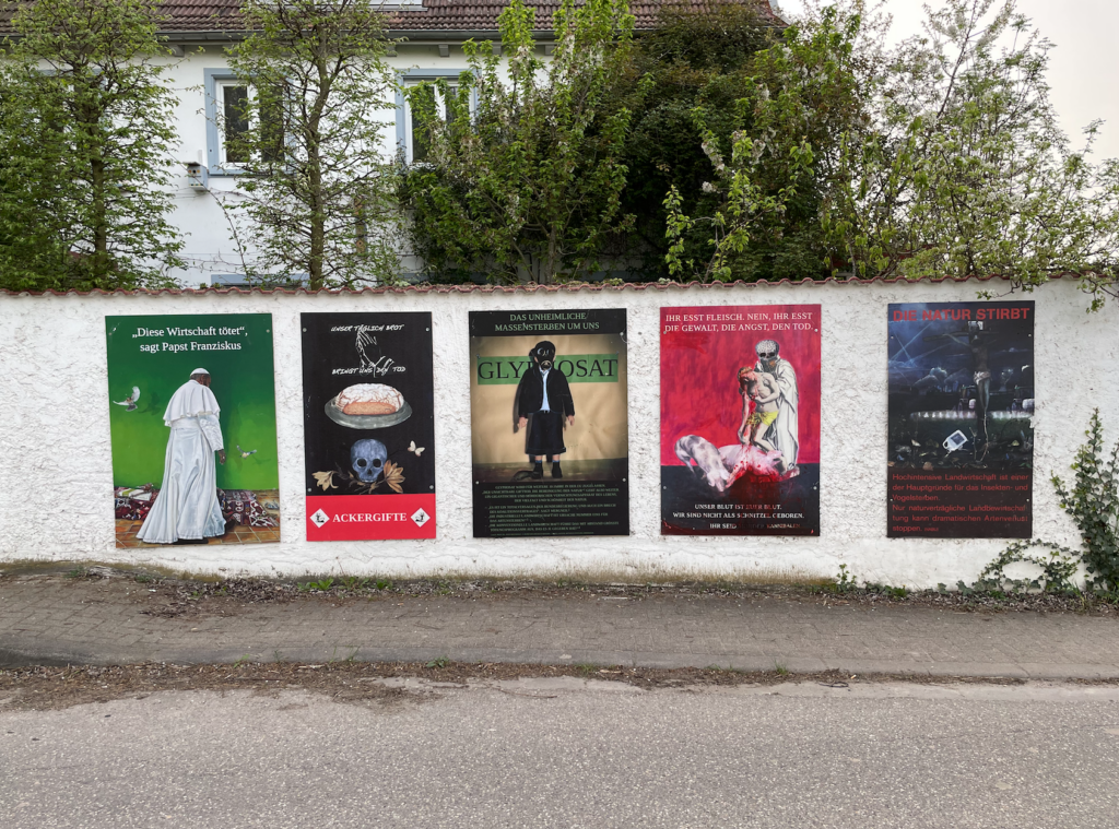 Als er auf die Idee kam, seine Hofmauer als „Outdoor Gallery“ zu nutzen, indem er fünf großformatige Plakate aus seiner Serie „Das Anthropozän – das große Sterben“ daran ausstellte, darunter auch welche, die die konventionelle Landwirtschaft mit fürs Artensterben verantwortlich machten, wurden mehrere davon zerstört. Das kunstfeindliche Verhalten fand Eingang in eine Anfrage der CDU im Ortschaftsrat, die Bilder könnten verstörend wirken, „vor allem für Kinder“, hieß es zur Begründung, die Verwaltung wurde aufgefordert zu prüfen, ob die Plakataktion zulässig ist. Sie sei es, befand das Landratsamt, und die Regionalzeitung berichtete ausführlich.