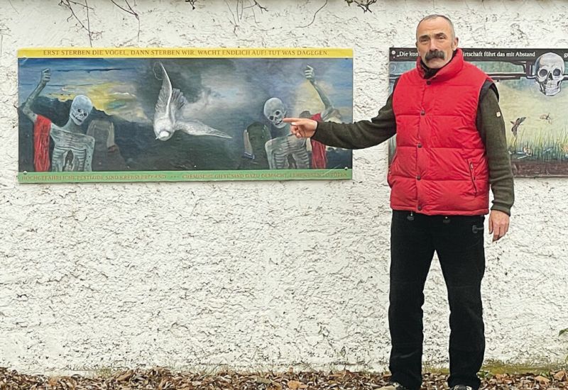 Hermann Weber will mit seiner Kunst auch Anstoß erregen. Das ist ihm in seinem kleinen Dorf gelungen. Das ist gut so, befindet er mit einem gewissen Unbehagen, denn die Zerstörung seiner künstlerischen Arbeit ist eine inakzeptable Grenzüberschreitung – wehret den Anfängen! „Für uns geht kein einfaches Jahr zu Ende“, schreibt Weber kurz vor Weihnachten. Bruno war an einer Vergiftung schwer erkrankt, und Webers Aktionismus wird auch in der Kunstszene nicht sonderlich goutiert, aber der sture Oberschwabe ist von seiner Mission überzeugt. „Meine Antwort ist ein weiteres Plakat: Erst sterben die Vögel, dann sterben wir.“ Das Thema lässt den Bauernsohn in Erinnerung an seine Eltern und deren tiefen Glauben an die göttliche Schöpfung nicht mehr los.