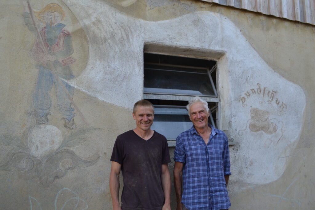 Vor 50 Jahren habe er anlässlich des Gedenkens an „450 Jahre Bauernkrieg“ – was damals kaum jemanden interessierte – an sein neu gebautes Milchhäusle ein Fresko malen lassen, es zeigt einen widerständigen Bauern und deren Symbol, einen Bundschuh. Unter diesem Zeichen revoltierten bereits vor dem großen Bauernkrieg 1525 regionale Bauernhaufen im Südwesten, auch sie wurden niedergeschlagen. Das Fresko soll dieser Tage restauriert werden, darin sind sich Vater und Sohn einig. Es geht schließlich um die Geschichte, als Bauern gemeinsam um eine bessere Zukunft kämpften.