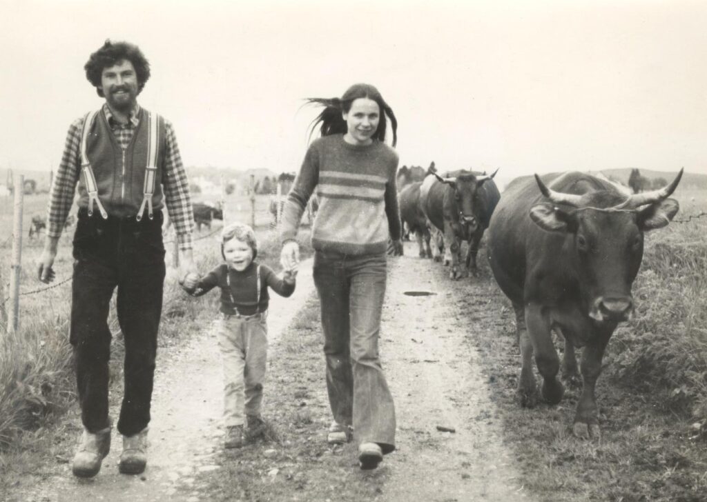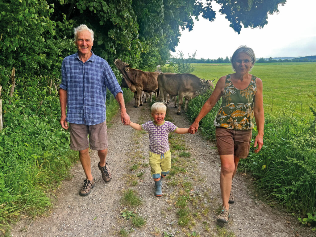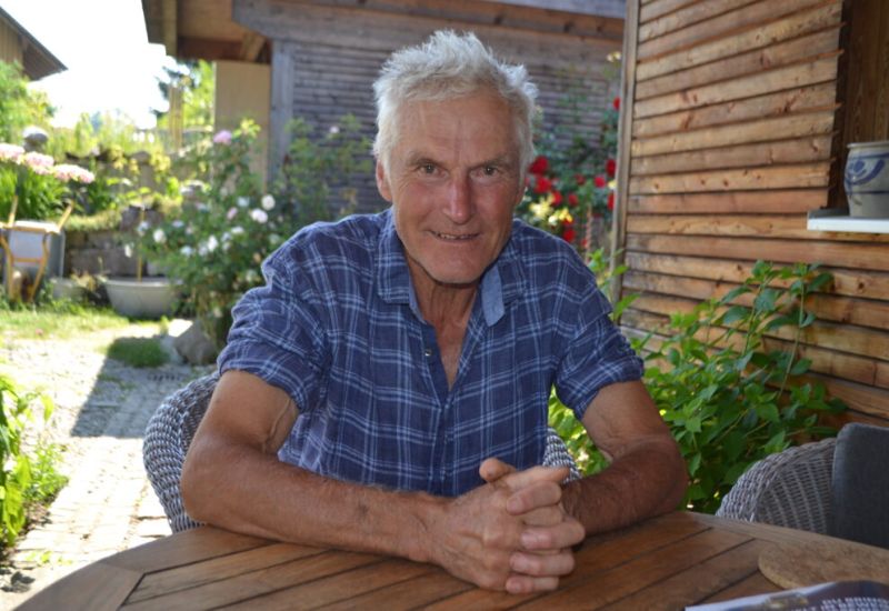 Die Tür ist unverschlossen, aber es ist niemand dahoim. Alfons Notz kommt mit dem Fahrrad angesaust. Seit zehn Jahren, als er den Hof an seinen jüngsten Sohn übergab, hat er schon kein eigenes Auto mehr. Mit Fahrrad und Bahn komme er überall hin und wenn nicht, weil das Wetter zu mies ist, dann könne er sich ein Auto aus der Nachbarschaft leihen. Er sei „ein Mensch der Selbstversuche“. So war es schon 1976, als er mit 26 Jahren den elterlichen Hof übernahm und wissen wollte, ob das mit Bio funktioniert. Die ersten zehn Jahre seien hart gewesen, es fehlte ihm an Wissen, Erfahrung, einem Netzwerk und einem auskömmlichen Vertrieb. Es fehlte eigentlich an allem, außer an einer Frau, die den Weg mitging. „Biobauer“ sei ein Schimpfwort gewesen und sein Vater hätte am Stammtisch und die Kinder in der Schule „gelitten“, erzählt der Bauer. Es hätte viele Jahre gedauert, bis er die ersten Wiesen, die er dringend brauchte, zur Pacht bekam. Heute ist der 60 Hektar große Biohof mit 34 Milchkühen und 45 Kälbern und Rindern der letzte Vollerwerbler von ehemals sieben Bauernhöfen in Weipoldshofen. Und Alfons Notz sitzt auf der Holzterrasse seines schicken „Ausdinghauses“ umgeben von Rosenstöcken seiner Frau Marlise einer gebürtigen Schweizerin, und freut sich, dass er noch gebraucht wird. „Ich bin Bauer mit Leib und Seele.“