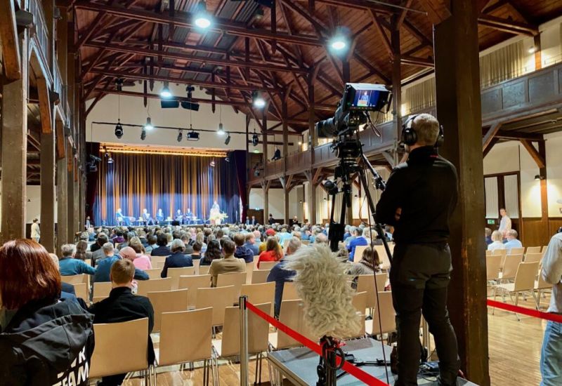 Schon am Nachmittag kreiste ein Hubschrauber über der Stadt, rund um die Gigelberghalle standen Absperrgitter, viele Polizei-Mannschaftswagen, TWH-Fahrzeuge, Einsatzwagen des DRK. Schon auf der Zufahrt wurden die Eintrittskarten kontrolliert. Gut fünf Wochen nach dem völlig aus dem Ruder gelaufenen Politischen Aschermittwoch der Grünen vor der Stadthalle ging es am 22. März auf dem Gigelberg beim Politischen Abend um politische Streitkultur. Menschen warteten an zwei Absperrungen darauf, in die Halle gelassen zu werden. Sie wurden abgetastet, ihre Taschen kontrolliert. An der Garderode waren Taschen und Jacken abzugeben. Nicht alle, die die kostenlosen Karten abgeholt hatten, erschienen auch, einige Stühle blieben leer. Die Veranstaltung wurde zudem live gestreamt.