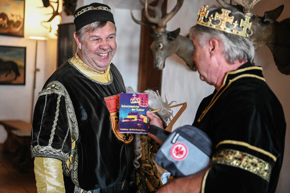 Der „Burgherr“ Max Haller (links) überreicht „Schauspieler“ Role Roth sein Buch über die Geschichte der Waldburg