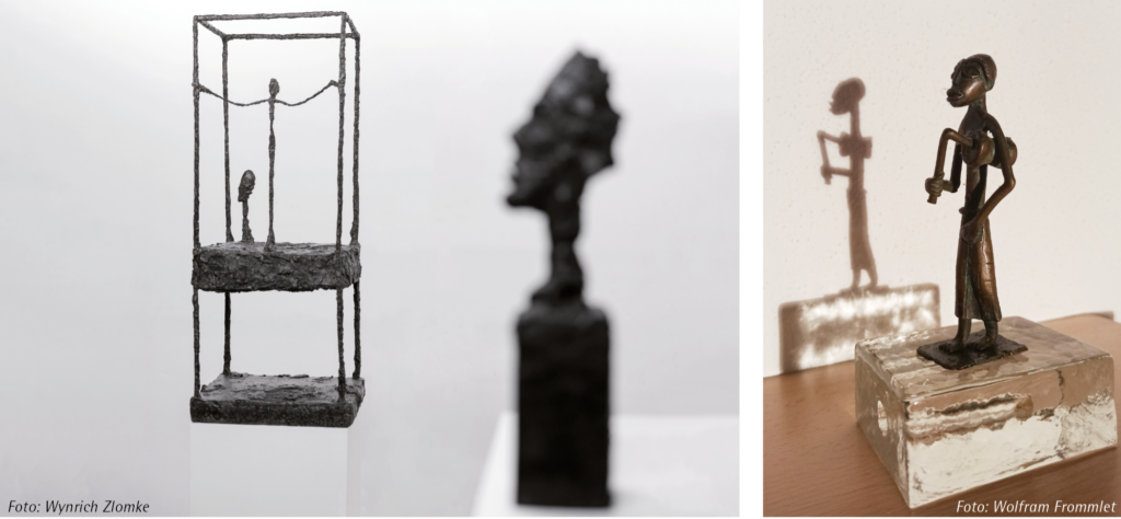 Giacomettis Skulpturen und Figurinen entbehren jeder Dominanz. Und so erscheint es stringent, dass er in seinen Schaffensphasen von den 50er Jahren bis zu seinem Tod 1966 in winzigen Skulpturen, in sehr vielen Zeichnungen der Sammlung Kleman „den Menschen“ reduziert auf Köpfe, auf durchdringende Blicke, einen Mund, eine Stirn. Stundenlang mussten seine Modelle stillsitzen, ihn anblicken. Manche seiner Gesichter lassen einen kaum los. In ihrer Offenheit, ihrer Herausforderung. Zu was? Zum Dialog, zum Widerspruch, zur Wahrnehmung, dass es so viele „Menschlichkeiten“ gibt? Auch dies macht diese Ausstellung gesellschaft-lich so brisant. Wo immer mehr Menschen die anderen nicht mehr wahrnehmen, die am Rand der Gesellschaft eh nicht. Home office und selbst draußen in der Wirklichkeit kommunizieren mehr Menschen mit dem Smartphone, dem Tablet statt mit Menschen. Wahrheit und Wirklichkeit, zwei zentrale Begriffe in Giacomettis Schaffen. Was sind sie heute, 58 Jahre nach seinem Tod? Eine ganz persönliche Begegnung mit Alberto Giacometti sei noch erwähnt. Ich wusste, dass er auch inspiriert war von afrikanischer Kunst, afrikanischen Skulpturen. Zu Hause fand ich in meiner afrikanischen Kunst eine kleine Skulptur aus Ghana, die doch verblüffende Ähnlichkeiten zu seinen hat.