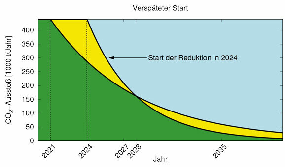 Das Diagramm zeigt die Situation im Jahr 2024 nach drei Jahren ohne Reduktionen. Die gelbe Fläache zeigt, wie ab 2021 zuviel CO2 emittiert wurde, was durch eine deutlich steilere Reduktion ab 2024 ausgeglichen werden muss.