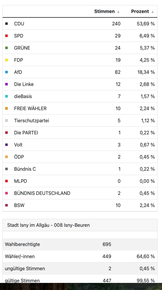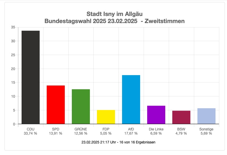 Das Isnyer Gesamtergebnis haben wir bereits am Sonntagabend vermeldet. Es lautet wie folgt: CDU vor AfD und SPD. Im Einzelnen: Die CDU holte in Isny 33,7 Prozent der für die Sitzverteilung im Bundestag entscheidenden Zweitstimmen. Auf die AfD entfielen 17,7 Prozent, auf die SPD entfielen 13,9 Prozent, auf die Grünen 12,6 Prozent. Auf den weiteren Plätzen folgen: Die Linke mit 6,6 Prozent, FDP mit 5,1 Prozent, BSW mit 4,8 Prozent und Sonstige mit 5,7 Prozent. Entnommen der Homepage der Stadt am 23. Februar um 21.17 Uhr.