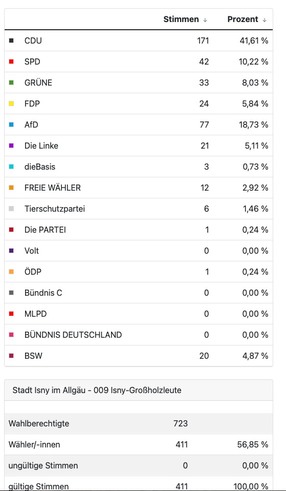 Das Isnyer Gesamtergebnis haben wir bereits am Sonntagabend vermeldet. Es lautet wie folgt: CDU vor AfD und SPD. Im Einzelnen: Die CDU holte in Isny 33,7 Prozent der für die Sitzverteilung im Bundestag entscheidenden Zweitstimmen. Auf die AfD entfielen 17,7 Prozent, auf die SPD entfielen 13,9 Prozent, auf die Grünen 12,6 Prozent. Auf den weiteren Plätzen folgen: Die Linke mit 6,6 Prozent, FDP mit 5,1 Prozent, BSW mit 4,8 Prozent und Sonstige mit 5,7 Prozent. Entnommen der Homepage der Stadt am 23. Februar um 21.17 Uhr.