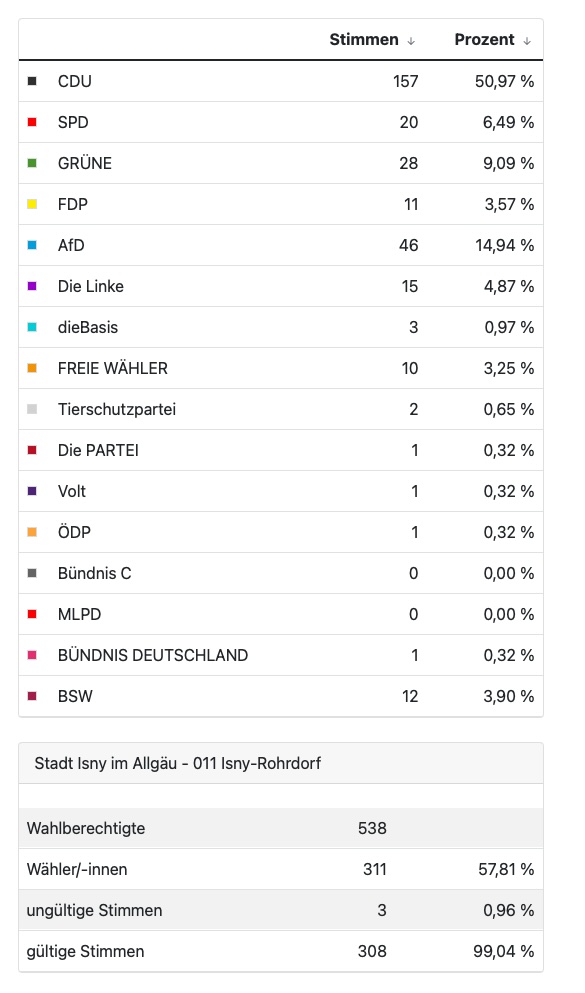 Das Rohrdorfer Bundestagswahlergebnis 2025 (ohne Briefwahlstimmen). Entnommen der Webseite der Stadt Isny.