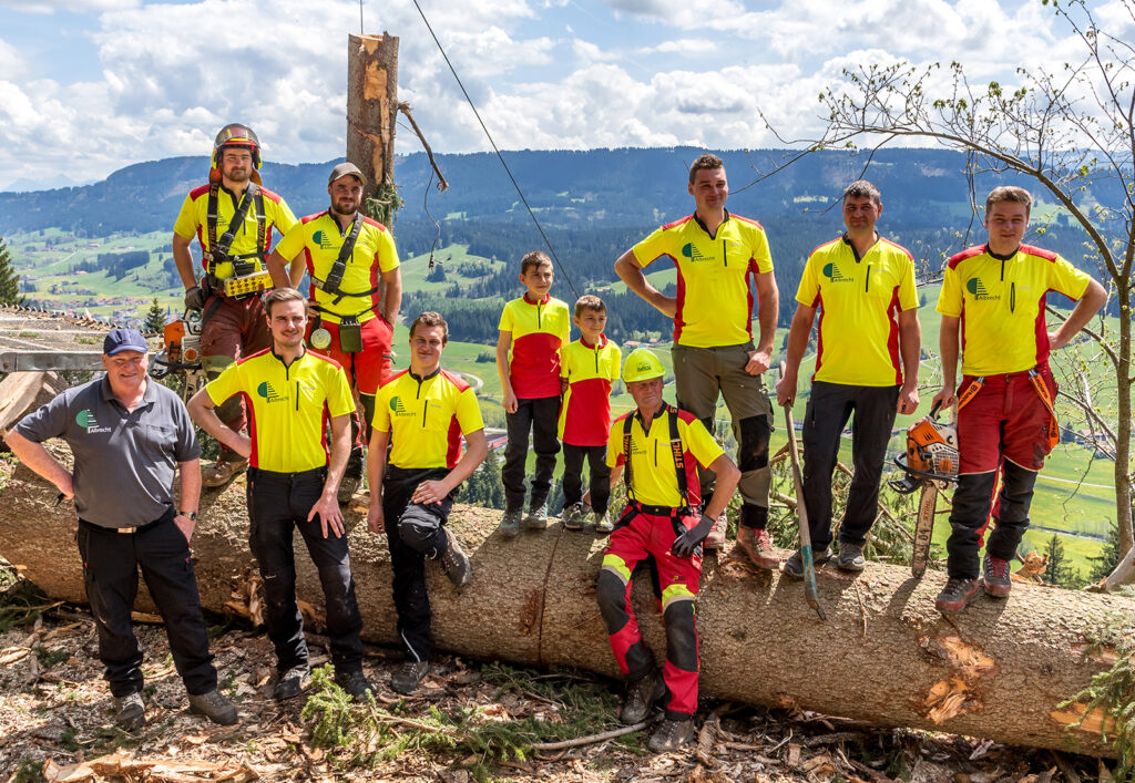 Familie Albrecht mit Mitarbeitern. Auf dem Stamm sitzend Mitinhaber Hermann Albrecht. Dahinter Sohn Roman und rechts daneben Sohn Thomas. Die Buben sind Enkel von Hermann. Links Mitinhaber Remig Albrecht mit Söhnen Manuel und Kilian. Die Belegschaft umfasst noch weitere Mitarbeiter. Foto: Julia Merkel Photography