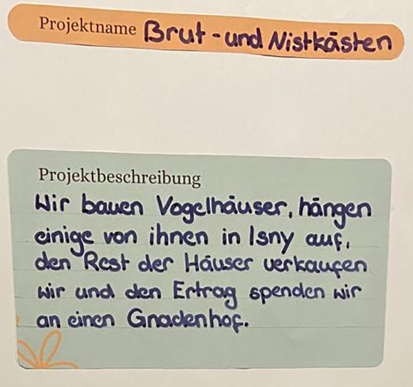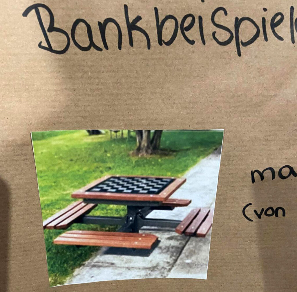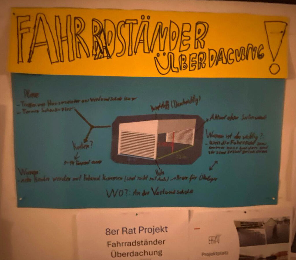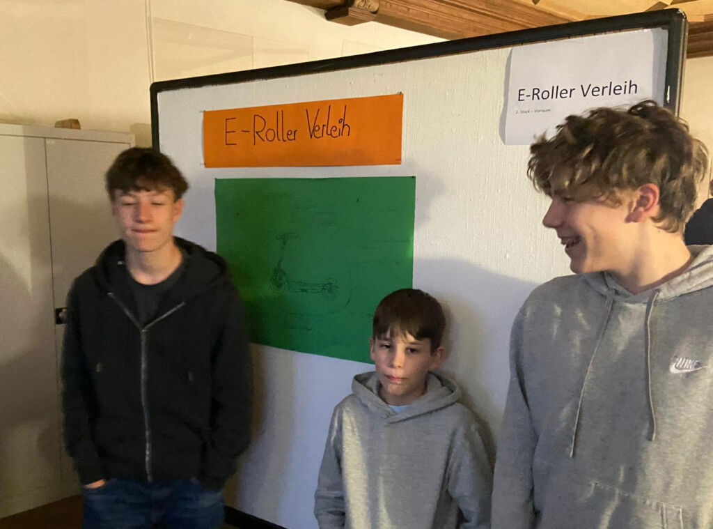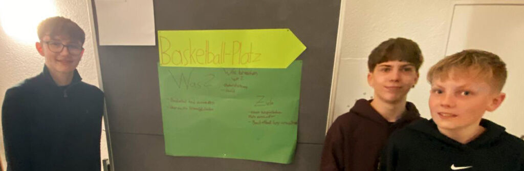 Und in Bewegung kommen. Mal mit einem „E-Roller-Verleih“ – vorgeschlagen aus der 8c der Verbundschule. Mal mit „einem Basketballplatz im Stadion“, von dem einige in der a des Gymnasiums sprechen. Dort zeigt sich auch die Idee für „einen Volta-Käfig“ mit Imbiss am Sportplatz.