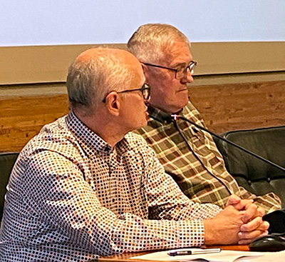 Klaus Hägele vom Ordnungsamt und Bauhofleiter Albrecht Kolb (rechts) in der Sitzung des Technischen Ausschusses am 20. April. Foto: Julian Aicher