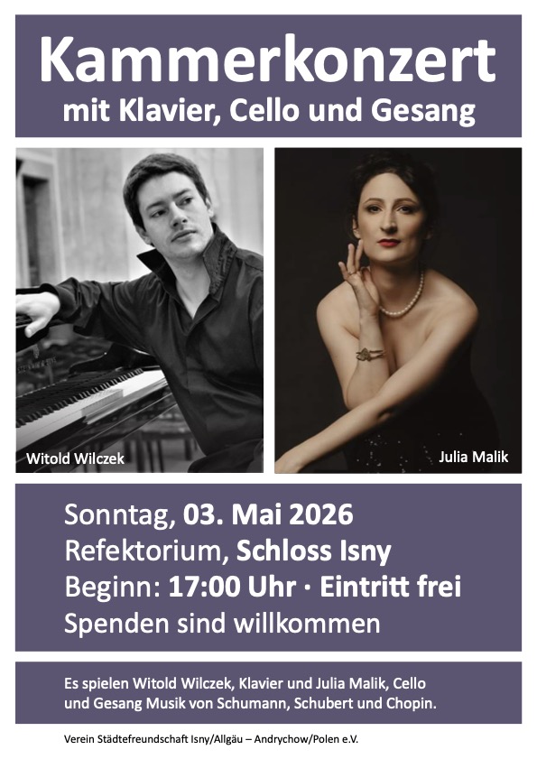 Isny – Liebe Mitglieder und Freunde des Partnerschaftsvereins, wir laden Sie herzlich zu einem besonderen Kammerkonzert im Refektorium, Schloss Isny, am Sonntag, 3. Mai, um 17.00 Uhr, ein: