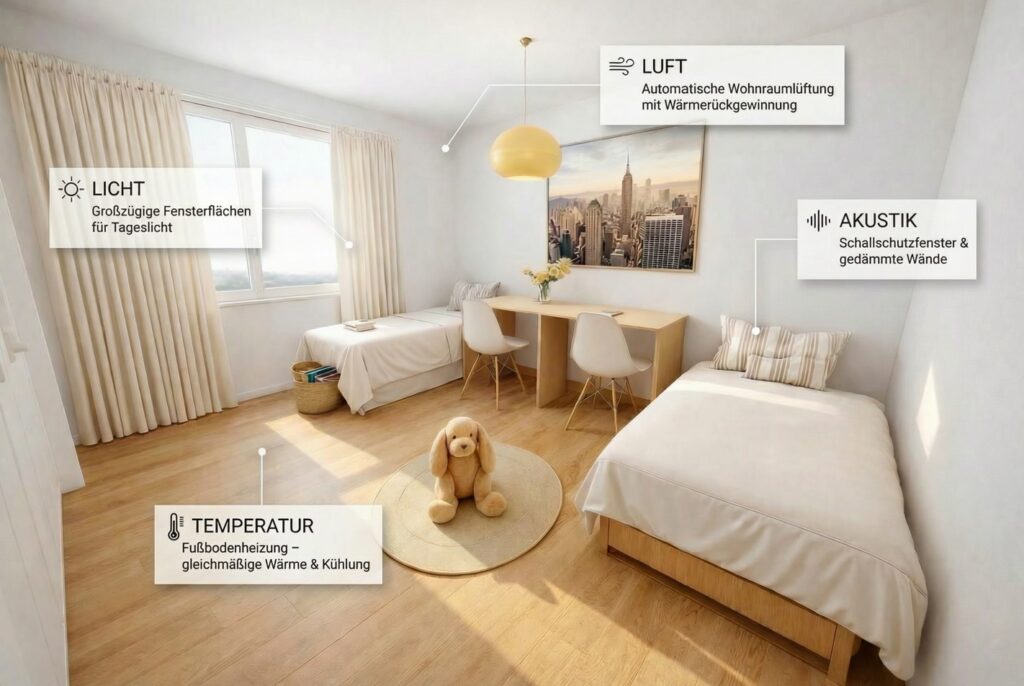 Besonderen Wert legt das Projekt auf Nachhaltigkeit und Wohnkomfort: Die Gebäude sind als Effizienzhaus 40 NH mit Grundwasser-Wärmepumpe, DGNB-Zertifizierung, Photovoltaik-Anlagen für Mieterstrom, ausgezeichneter Wärmedämmung und automatischer Wohnraumlüftung mit Wärmerückgewinnung geplant. Fußbodenheizung (im Sommer auch zur Kühlung nutzbar), erhöhter Schallschutz, barrierearme Erschließung bis in die Tiefgarage sowie hochwertige Ausstattungsdetails wie Eichenparkett und bodengleiche XXL-Duschen sorgen für ein gesundes Wohnklima und niedrige Nebenkosten.