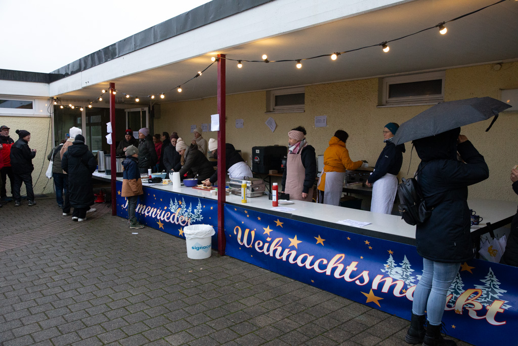 Nach dem einstündigen Konzert öffnete der mittlerweile fest im Immenrieder Jahreskalender verankerte Weihnachtsmarkt. Unter tatkräftiger Mitwirkung der Eltern, Lehrer und Erzieher wurden die Besucher mit Punsch, Glühwein, Waffeln, Schupfnudeln und allerlei anderer Leckereien versorgt. Kaffee und Kuchen wurden wegen des schlechten Wetters erstmals in der bestuhlten Turnhalle gereicht.