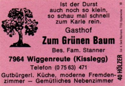 Das Hauptaugenmerk des Kalenderblatts liegt auf der Gastwirtschaft „Zum Grünen Baum“, die ab 1903 von den Wirtsleuten Haaga im Nebenerwerb (man hatte ja auch noch eine Landwirtschaft zu versorgen) betrieben wurde und 1954 von Karl Stanner und seiner Ehefrau übernommen wurde. Karl Stanner war gebürtig aus Wallmusried, seine Eltern hatten dort eine kleine Kolonialwarenhandlung bei der Bahnhaltestelle. Auch bei Stanners war es so, dass der Ehemann tagsüber arbeiten war (er war lange Jahre Lkw-Fahrer beim Betonwerk Rinninger) und seine Ehefrau die Wirtschaft umtrieb. Abends und am Wochenende war Karl Stanner dann Wirt mit Leib und Seele, der aber auch die Autorität hatte, wenn es die Gäste mal übertrieben und sich prügeln wollten, kurzerhand den Hagenschwanz (Ochsenziemer) hinter der Theke hervorzuholen und damit wieder für Ordnung zu sorgen. Dass es dort gutes und reichliches Essen gab, sah man dem Wirt mit Zeit auch an und man nannte ihn liebevoll den „Ranzenwirt“. Fremdenzimmer wurden auch angeboten, 1970 wurden die Zimmer aufwändig renoviert. Die Gaststätte war beliebt und immer gut besucht, an Sonn- und Feiertage fanden viele Familienfeiern dort statt. Außerdem konnte man dort weitrum die besten Grillhähnchen bekommen. Die konnte man auch telefonisch vorbestellen und abholen. Das Ritual war jedes Mal das gleiche. Als Abholzeit wurde 19.30 Uhr vereinbart, wenn man aber um diese Zeit hinkam, hieß es stets: „Sind noit ganz fertig, sitz na und trink no a Halbe.“ Wenn die Halbe leer war, waren dann auch die Hähnchen fertig. Die Gaststätte wurde bis 2011 betrieben, später war es nur noch eine Pension mit Fremdenzimmern. Die Wirtsleute waren da auch schon beide über 80 Jahre alt. Karl Stanner starb 2016 mit 86 Jahren, seine Ehefrau Maria 2021 mit 87 Jahren.