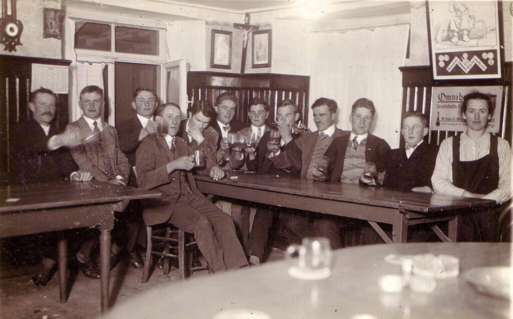Im „Grünen Baum“: Wirtin Haaga mit Gästen. 1933.