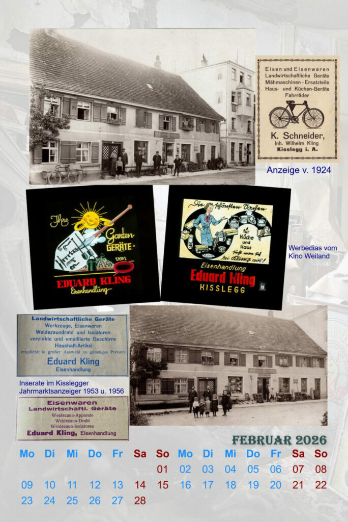 Kißlegg – Das Kalenderblatt vom Februar 2026 in Bernd Mauchs Kißlegg-Kalender ist der ehemaligen Eisenhandlung Kling in der Jägerstraße gewidmet. Das Gebäude wurde ca. 1752 errichtet, ist also eines der ältesten Häuser in Kißlegg. Ortsheimatpfleger Bernd Mauch stellt seinen Kalender vor: