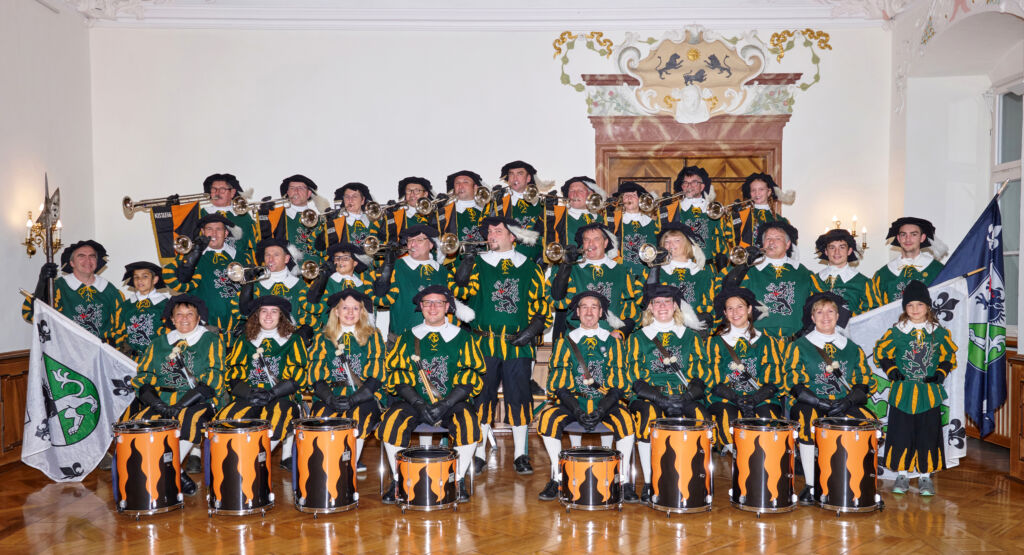 1969 wurde die zweite Uniform beschafft. Der Fanfarenzug und das Repertoire wurden erweitert, auch durch Eigenkompositionen, und 1971 wurde schließlich die jetzige Uniform angeschafft. Die Hose ist in den Farben Kolpings schwarz-orange, das Wams in grün für Kißlegg und auf dem Brustteil ist das Kißlegger Wappentier, der Greif, aufgestickt. Wir tragen Landsknechts-Uniformen im Stil des 15. Jahrhunderts.