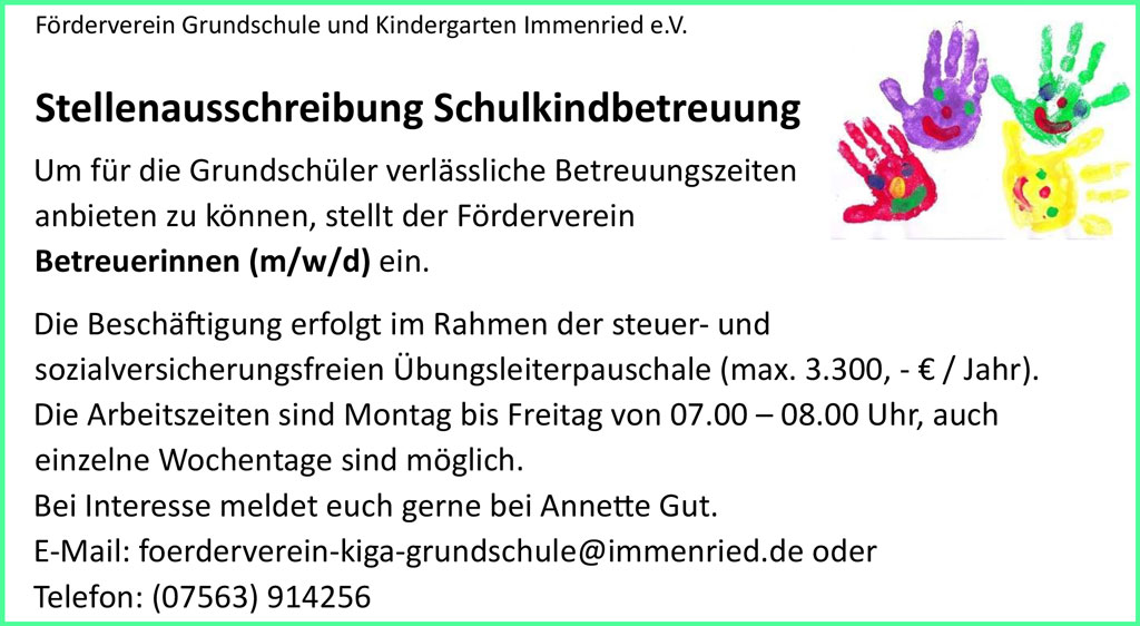 Damit die Betreuung auch künftig gewährleistet werden kann, freuen sich die Mitglieder des Fördervereins über interessierte Bewerberinnen und Bewerber sowie über jede Weitergabe der Ausschreibung. Auch rüstige Rentnerinnen und Rentner, die sich gerne einbringen und den Betreuungsalltag der Kinder aktiv unterstützen möchten, sind herzlich willkommen.
