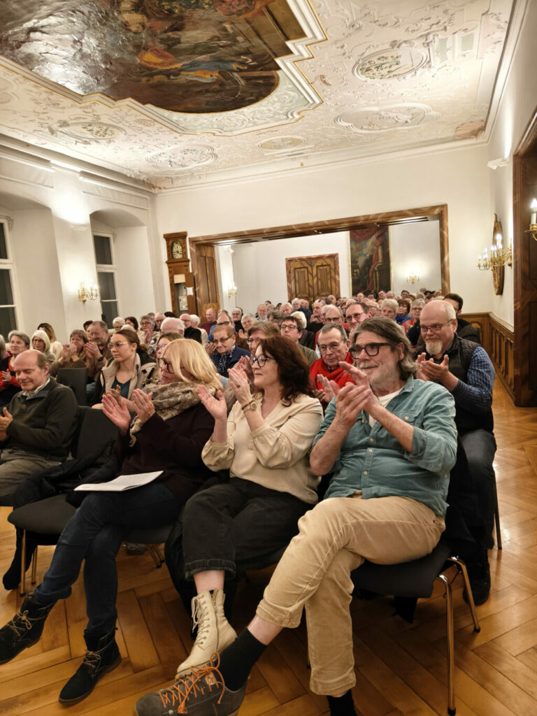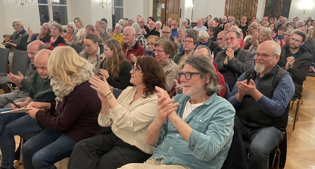 André Radke resümierte als Moderator im „rappelvollen“ Esthersaal die etwa einstündige Diskussion als Engagement, ganz im Sinne der von Bettina Lugk geforderten „Vorsorge“. Als Gemeinderat der Freien Wähler durfte er „in unserem Bürgerschloss“ nicht ohne Stolz als Ehrengäste den früheren Bundesarbeitsminister Walter Riester, den evangelischen Pfarrer Friedemann Glaser sowie MdB Martin Gerster (SPD) begrüßen.