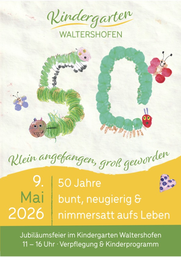 Waltershofen – Klein angefangen, groß geworden – 50 Jahre bunt, neugierig & nimmersatt aufs Leben. Der Kindergarten Waltershofen feiert Geburtstag! 50 Jahre voller Erinnerungen, Kinderlachen und Begegnungen – am Samstag, 9. Mai, von 11.00 bis 16.00 Uhr. Herzliche Einladung an alle ehemaligen Kinder und Erzieher, Familien und Freunde und alle, die diesen besonderen Tag mit uns feiern möchten!