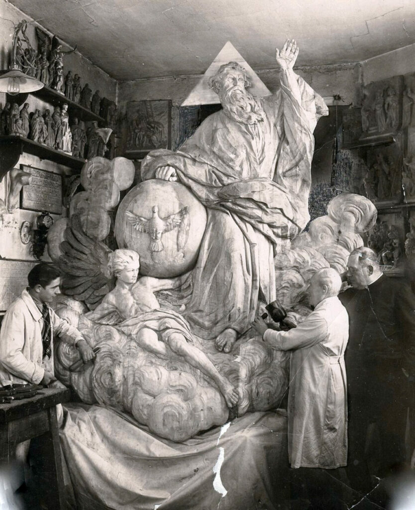 Die Altarskulptur für die Kißlegger Pfarrkirche im Atelier Schilt in der Schloss-Straße (damals Bahnhofsstraße). Neben Bildhauer Josef Schilt der damalige Kißlegger Pfarrer Emil Wahr. Undatiertes Bild (ca. 1936 bis 1938).