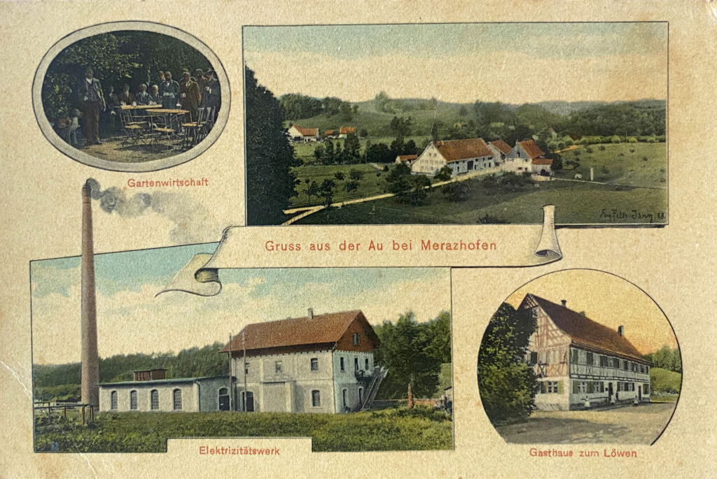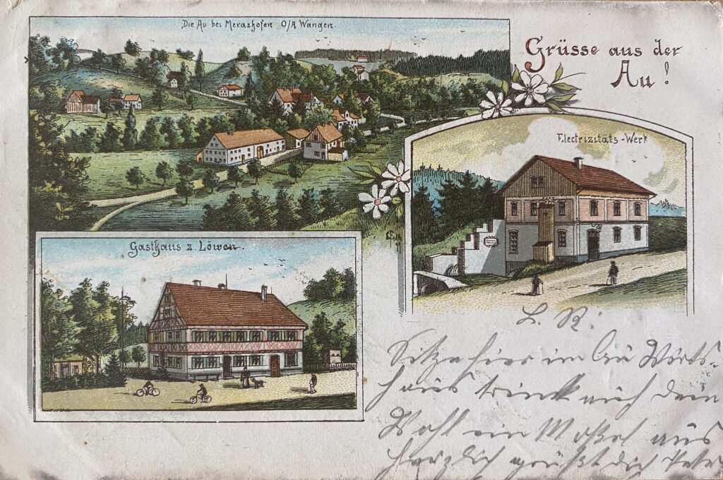 E-Werk und Gasthaus „Zum Löwen“ in der Au. Undatierte Postkarte.