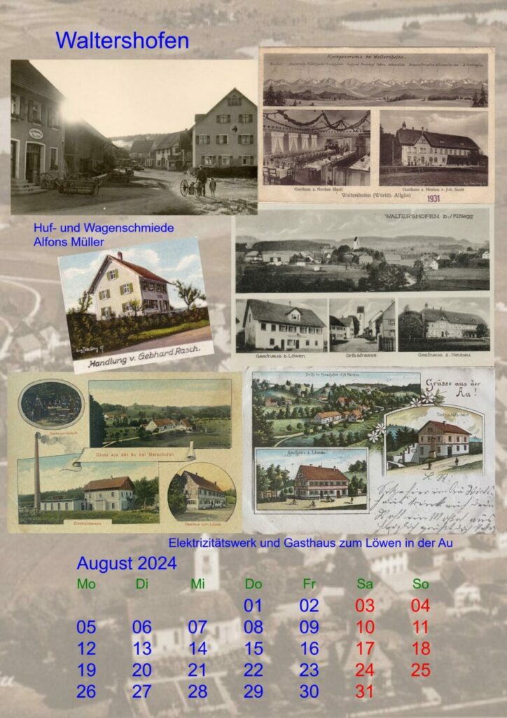 Waltershofen – Das Kalenderblatt vom August 2024 aus Bernd Mauchs historischem Kalender ist dem Dorf Waltershofen gewidmet.