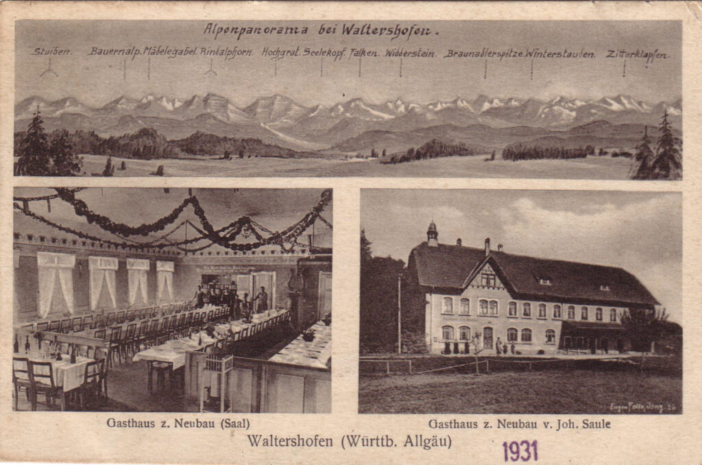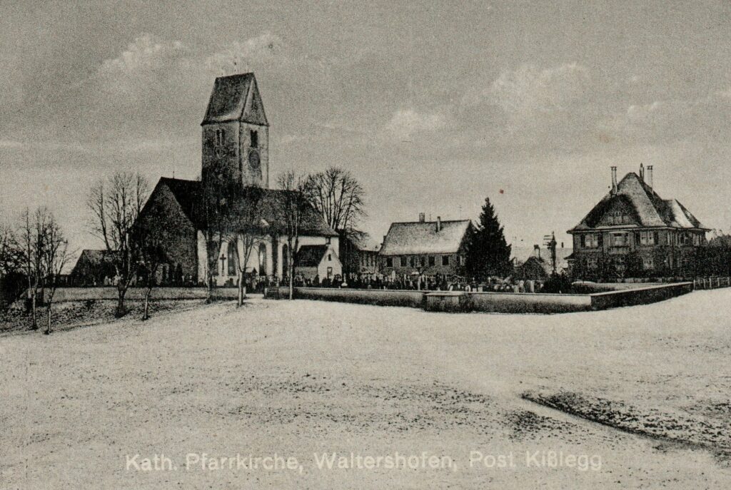 Zwar zu Kißlegg gehörend, fühlt man sich in Waltershofen immer noch eigenständig. Es gab in dem Ort früher ja auch alles, was eine selbständige Gemeinde braucht: Kirche, Schule, Kindergarten, drei Gastwirtschaften, Läden, eine Bäckerei, einen Huf- und Wagenschmied, eine Schreinerei, eine Zimmerei, ja sogar eine Autowerkstatt mit Tankstelle. Auch eine TÜV-Prüfstelle war hier angesiedelt. Die Fotos zeigen eine kleine Auswahl der Gewerbebetriebe in Waltershofen und zwei schöne Postkarten vom direkt an der Argen gelegenen Elektrizitätswerk und der gemütlichen Gaststätte von Mösles in der Au.