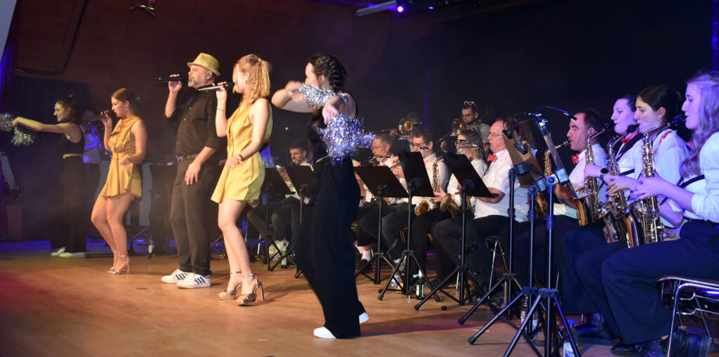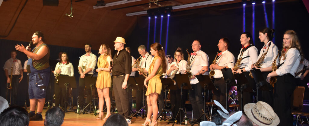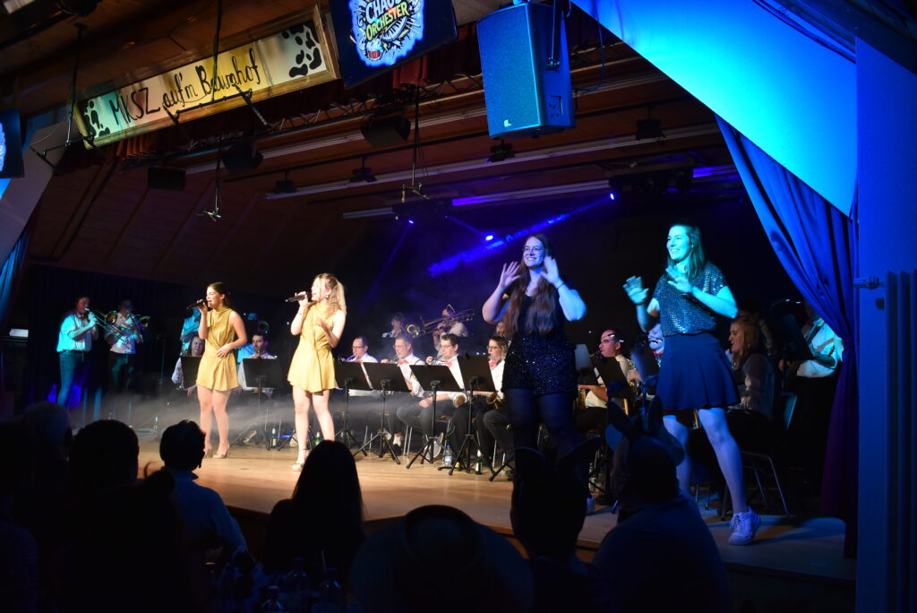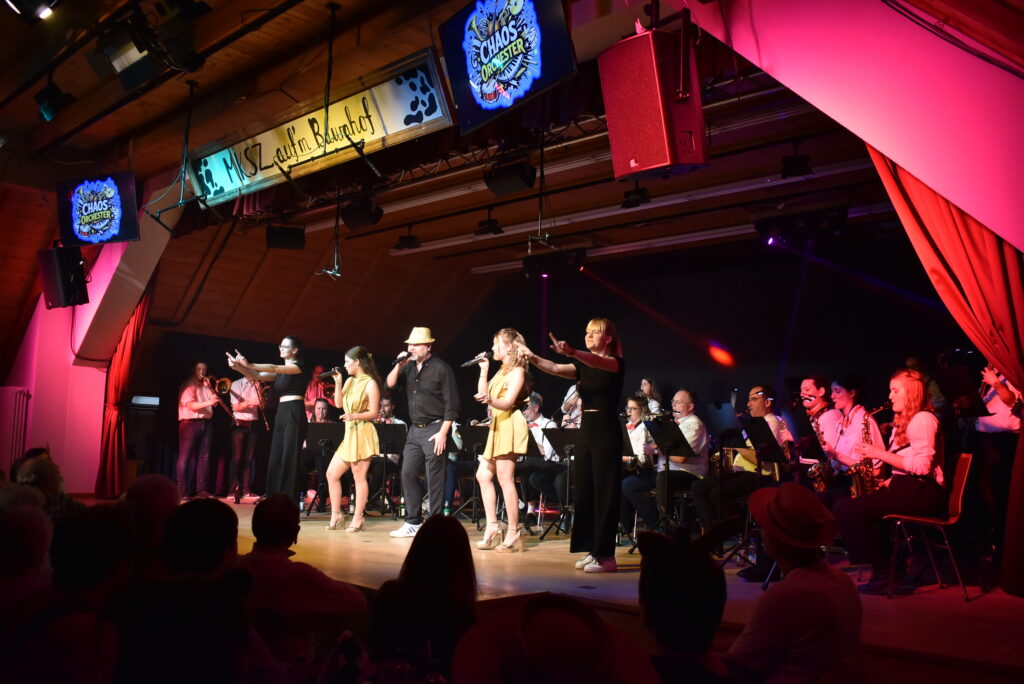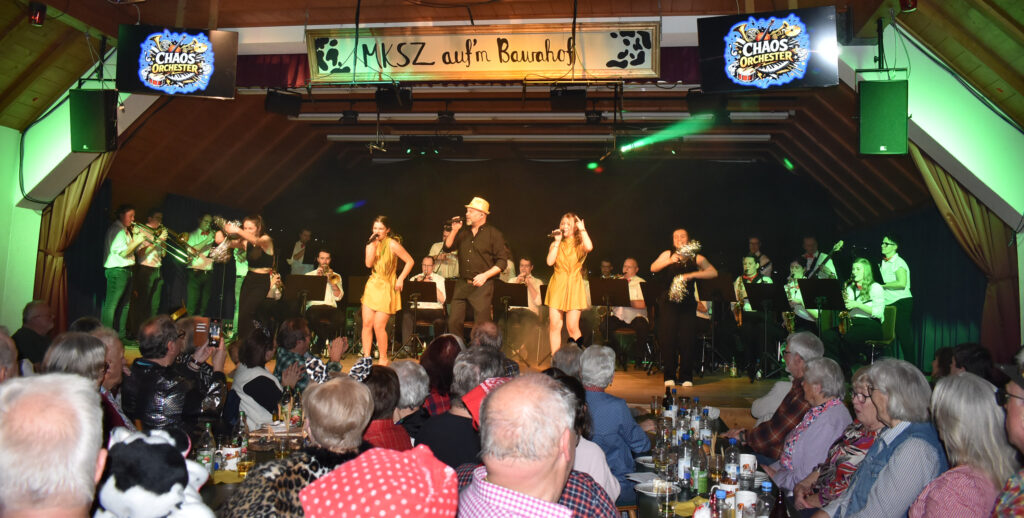 Zum Finale kommt fast die ganze Musikkapelle Schloß Zeil auf die Bühne als bekanntes „Chaos-Orchester“ und spielt auf, alles andere als chaotisch. Sie können alles, Blasmusik, Schlager, Pop, Jazz. Dazu singen Christa Kloos und Marina Kaufmann in professioneller Weise, in der Mitte Markus Kieble, mal als Sänger, mal als Dirigent.