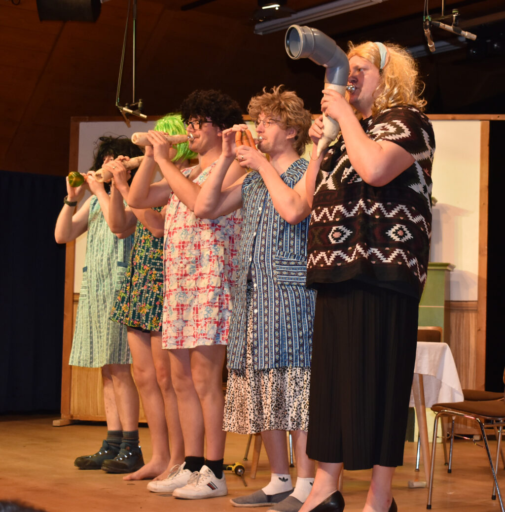 Zwischen Theater und Sketchen gibt es reichlich Musik und Gesang. Ein Blasmusik-Ensemble spielt die „Vogelwiese“ zum Mitsingen oder zeigt, dass man auch mit Gemüse Musik machen kann. Besonders gefällt eine reine Rhythmus-Melodie mit Besenschlagen auf den Boden.