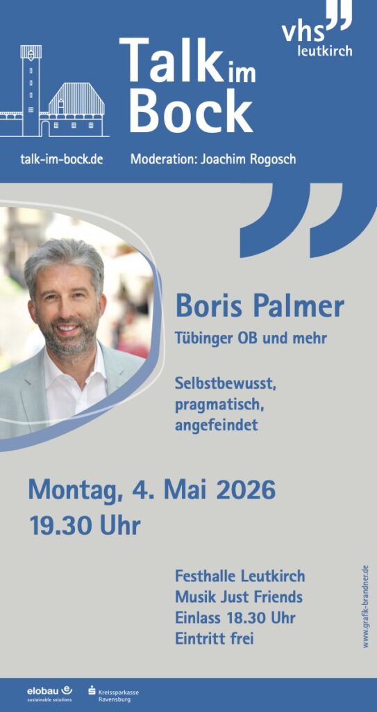 Leutkirch – Mit einem prominenten Gast findet am Montag, 4. Mai, der nächste Talk im Bock mit Moderator Joachim Rogosch statt. Auf dem Talk-Gast-Sessel sitzt dann Tübingens OB Boris Palmer. Aufgrund der zu erwartenden zahlreichen Besucher findet die Veranstaltung in der Festhalle am Konrad-Adenauer-Platz 1 in Leutkirch statt. Beginn ist um 19.30 Uhr, Einlass eine Stunde vorab. Für Bewirtung ist gesorgt, der Eintritt ist frei, um Spenden wird gebeten. Veranstalterin der Talk-Reihe ist die Volkshochschule Leutkirch. Weitere Infos unter www.talkimbock.de.