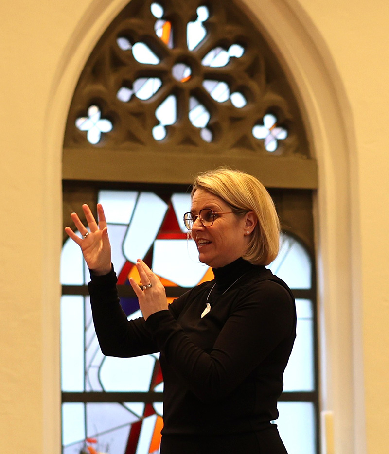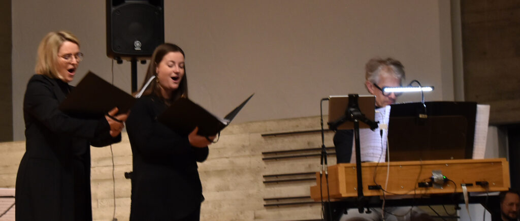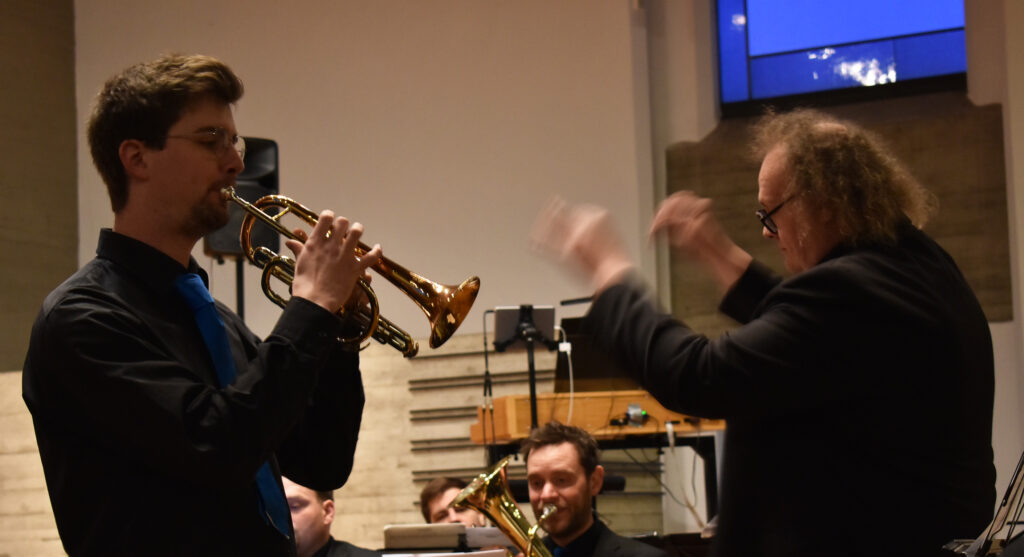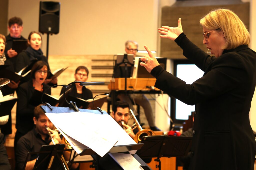 Unter der Gesamtleitung von Gertrud Hiemer-Haslach, die auch den Chor dirigierte, wuchs alles zu einem harmonischen Ganzen zusammen. Schon lange hatte sie sich gewünscht, einmal mit einer Brass-Band zu musizieren – ein Traum, den sie nun mit hörbarer Begeisterung verwirklichte. Mit klarer Zeichengebung arbeitete sie sowohl die leuchtende Strahlkraft als auch die feinen Linien der Musik heraus und führte Chor, Orgel und Bläser aufmerksam durch die anspruchsvollen Partituren.
