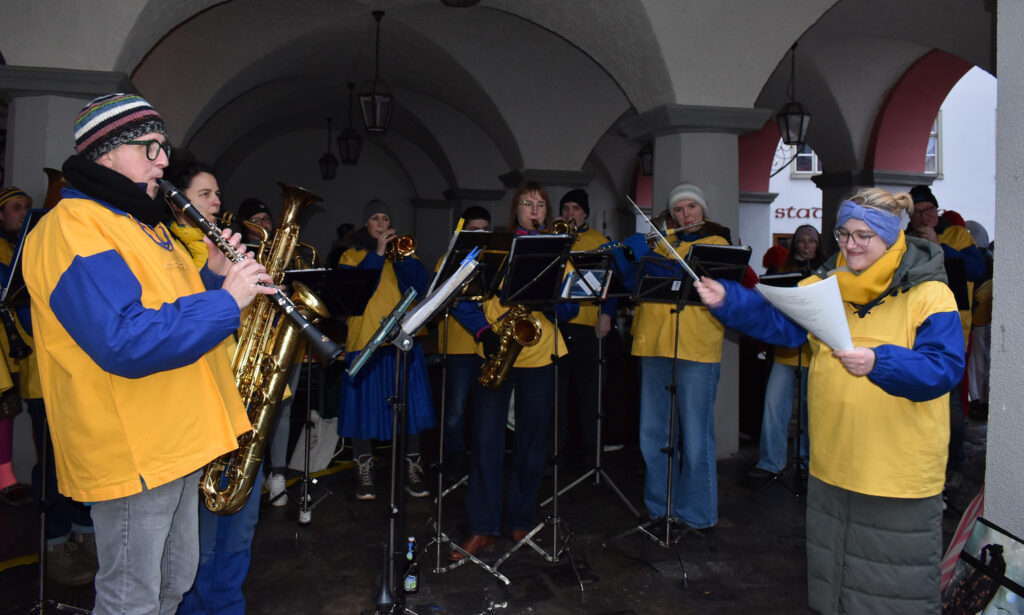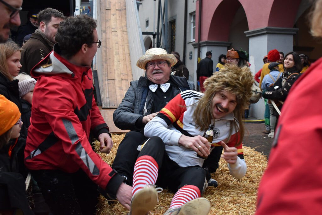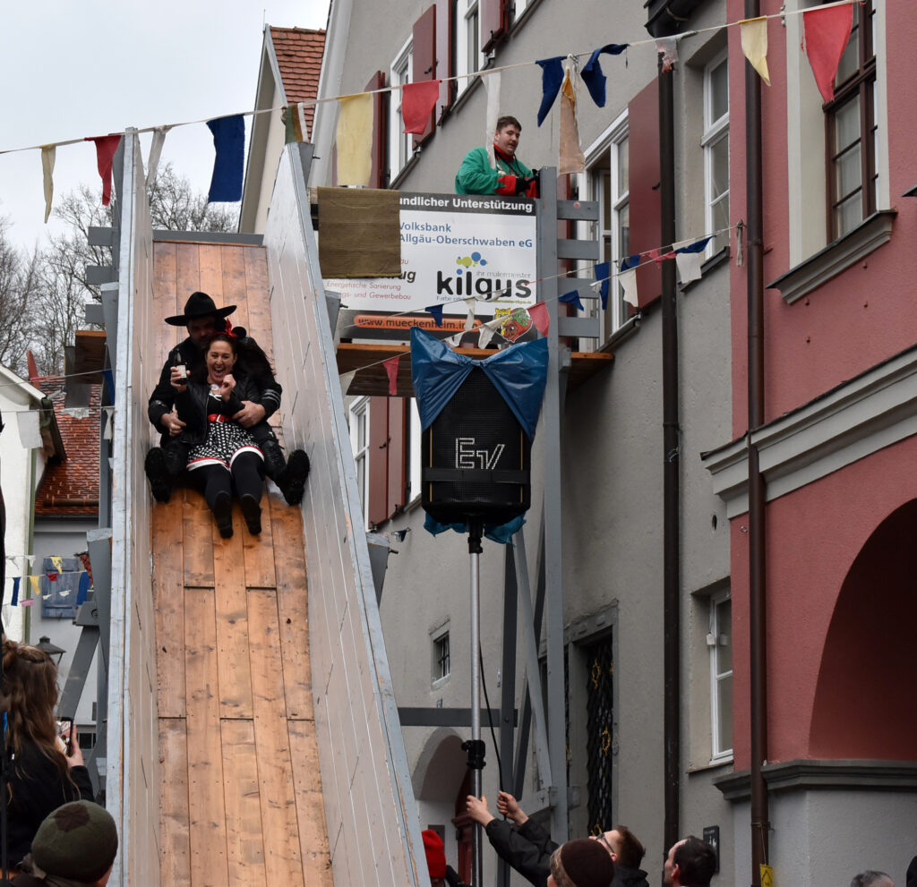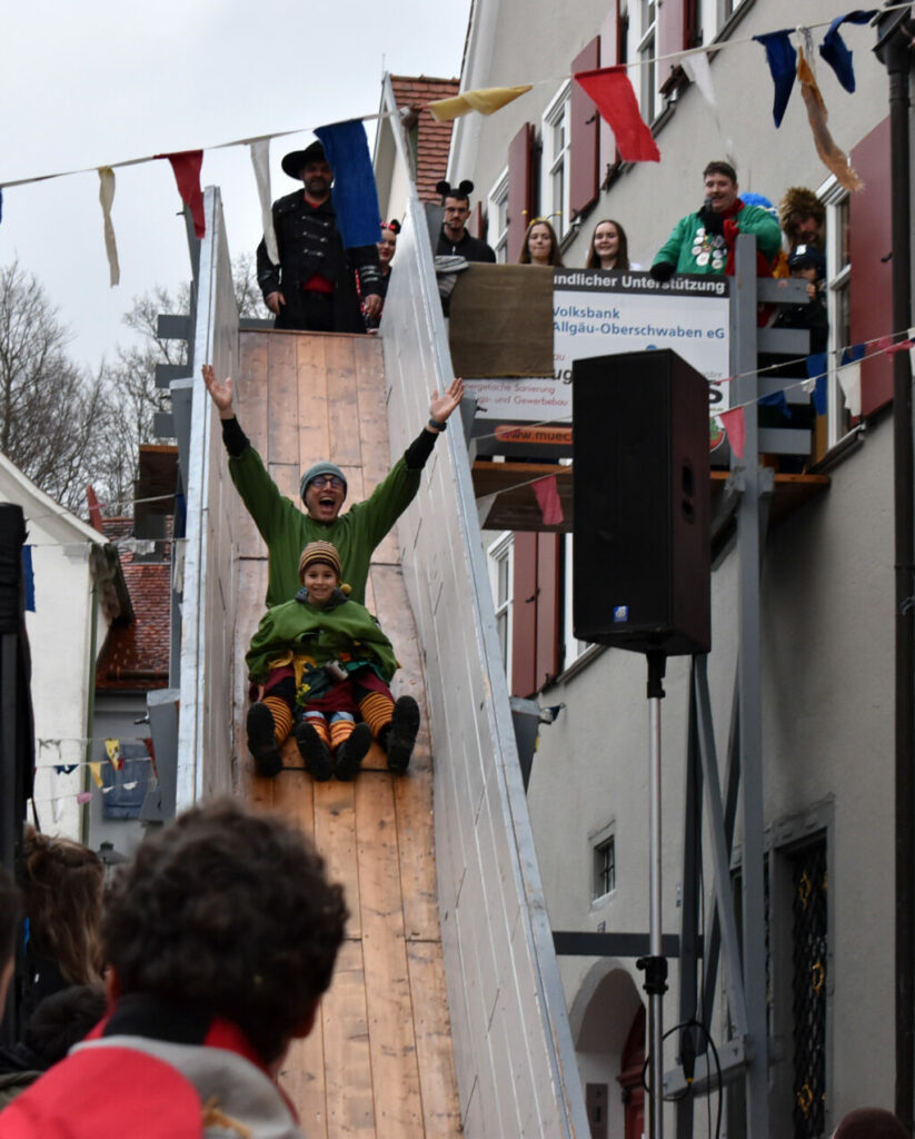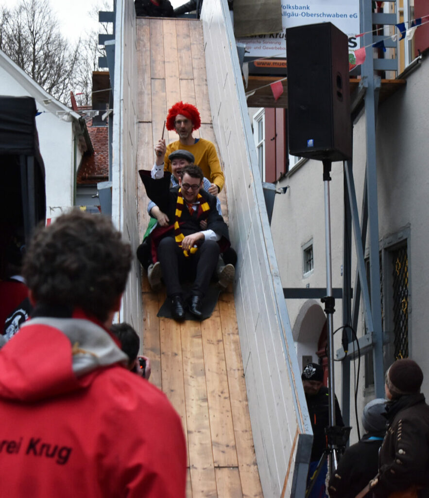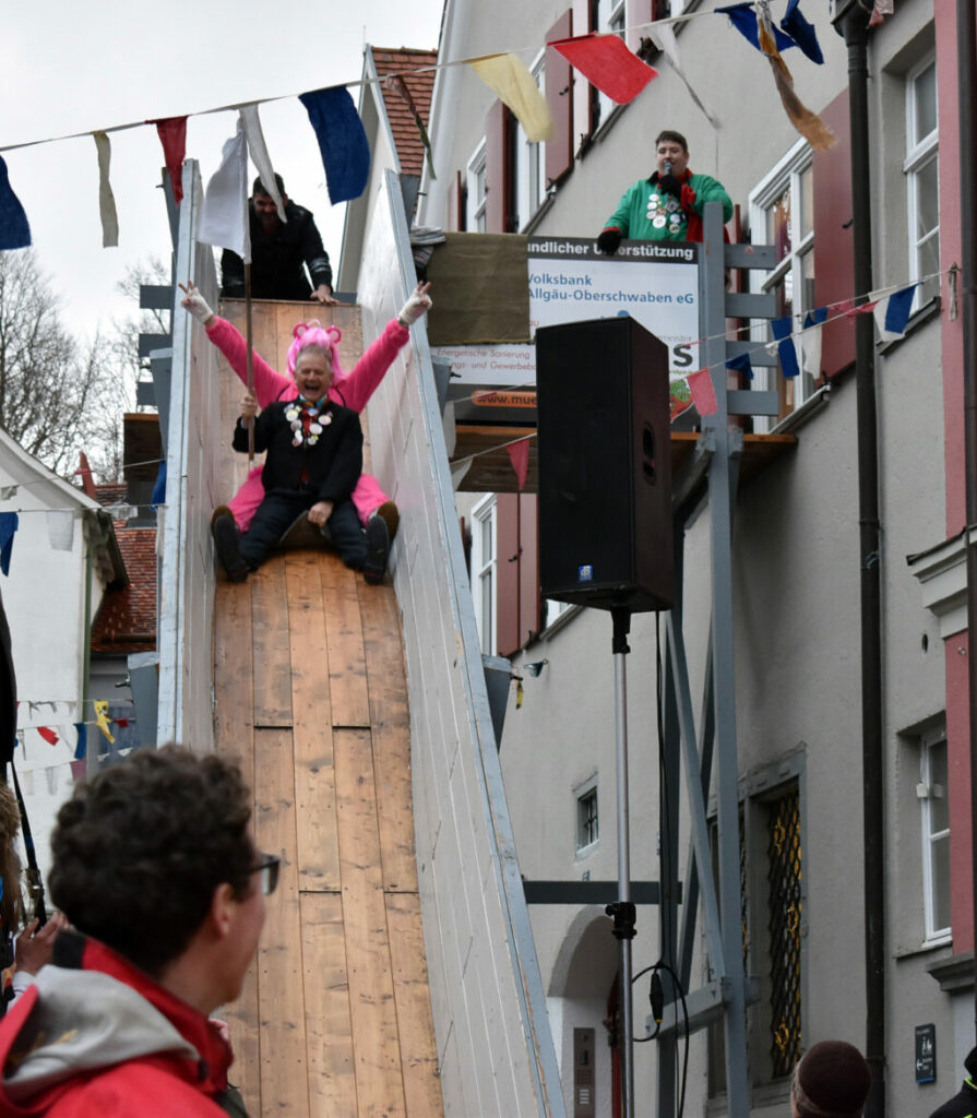 Leutkirch (rei) – Am Nachmittag des Gumpigen: Narren rotten sich vor dem Rathaus zusammen, ganz Mutige entern die Trutzburg von Hans-Jörg H. und seinen Getreuen über den Rathaus-Balkon. Rasch machen die Narren im Beamtentempel tabula rasa und entfernen die Bürokraten aus ihren Sesseln. Nach alter Sitte wird das Personal via Rutsche expediert. Doch, so gnädig sind die neuen Machthaber schon, die Griffelspitzer fallen weich. Die seitherige Nummer eins – das wurde allenthalben mit Respekt vermerkt – ist ein weitblickender Kopf: Vorsorglich hatte sich Hans-Jörg der Verflossene eine weiße Fahne besorgt. Thomas B., der nun das Sagen im Städtle hat, sah das Kapitulationstextil mit Wohlgefallen. Und freute sich an dem riesigen Rathaus-Schlüssel als Trophäe und Symbol der neuen Macht. Unsere Reporterin Carmen Notz hat den denkwürdigen Moment des Regierungswechsels mit der Kamera eingefangen: