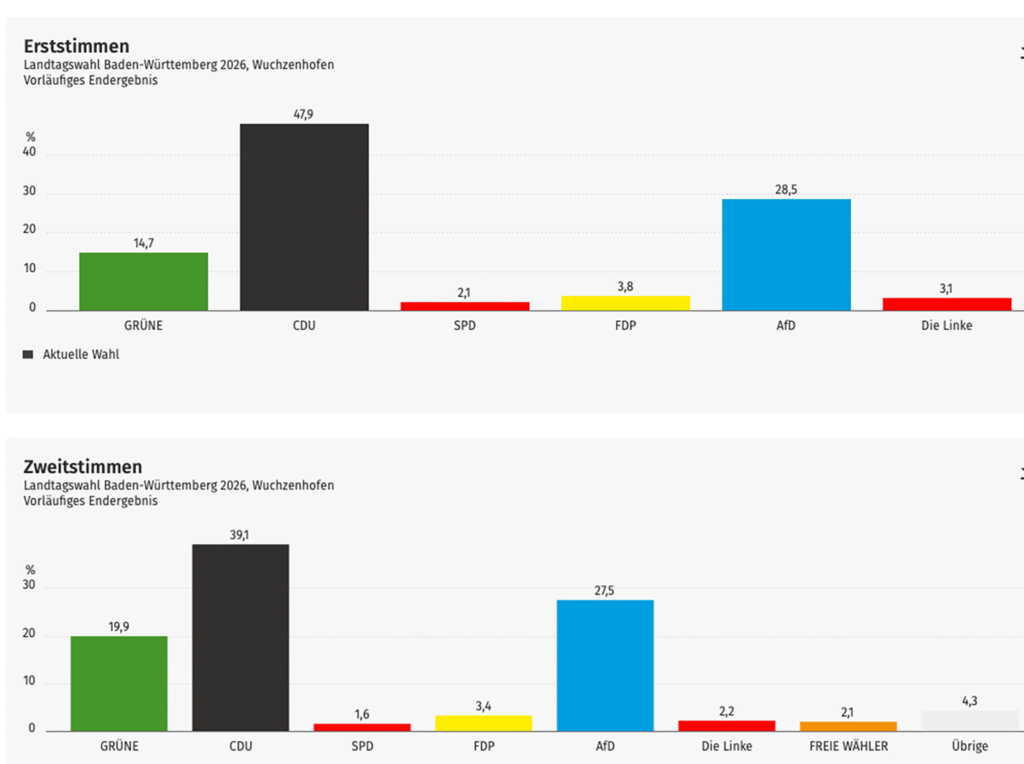 Für AfD-Kandidatin Carmen Haug votierten in Wuchzenhofen 28,5 Prozent der Wähler (Wahlkreis: 20,0 Prozent). Bei den Zweitstimmen erzielte die AfD ihr bestes Ergebnis mit 28,8 Prozemt in Gebrazhofen (Wahlkreis: 19,7; Land: 18,8 Prozent).