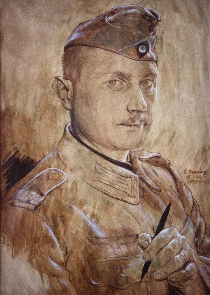 Einem Ruf als Lehrer an die Staatsschule für Angewandte Kunst in Nürnberg kann Erwin Henning 1939 nicht folgen, da er nicht Mitglied der NSDAP ist. 1941 wird er dann als Soldat eingezogen. „Ich war immer nur der Umhüllung, der Kleidung nach Soldat“, wird er sich später erinnern. Insofern freut er sich, dass es ihm 1942 gelingt, als Künstler nach der Grundausbildung bei einer der Propagandakompanien (PK) der Wehrmacht unterzukommen. Die PKs versorgen die Medien vor allem in Deutschland mit Text- und Bildmaterial zum Verlauf der verschiedenen Feldzüge. Hunderte von Journalisten, Fotografen, Kameramännern und eben auch bildenden Künstlern arbeiten für diese Abteilungen der Wehrmacht. Viele, die später die Medien der Bundesrepublik prägen sollten, erlernen hier übrigens ihr Handwerk, so etwa der Maler und Autor Lothar-Günther Buchheim oder der spätere Herausgeber der Illustrierten „Stern“ Henri Nannen. Erwin Henning kommt zunächst nach Potsdam, um für seinen Einsatz für die PK geschult zu werden.
